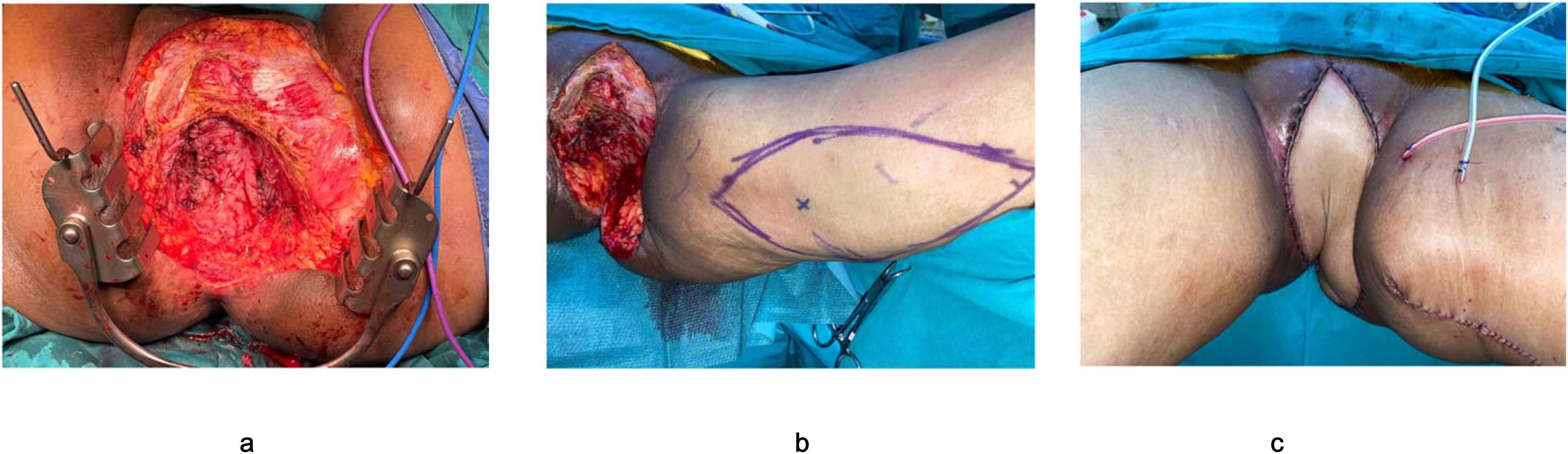 Figure 6. Reconstruction after pelvic exenteration with large perineal resection. (a) Placement of mucosa-removed colonic flap as neopelvic floor. (b) Pedicular myocutaneous flap planned from the patient’s thigh. (c) Reconstruction of large perineal defect with a well-vacularized myocutaneous flap.
