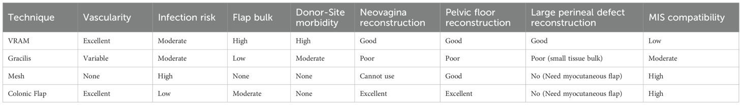 The choice of reconstructive technique involves a trade-off between reconstructive goals and procedure-related morbidity. Table 1 synthesizes the literature, comparing the main reconstructive options. This comparison highlights a fundamental divide. The VRAM flap provides excellent vascularity but at the cost of high donor-site morbidity and notable rates of recipient-site complications like partial flap necrosis and functional deficits. Mesh reconstruction eliminates donor-site morbidity but trades it for a high risk of failure at the recipient site. The colonic flap occupies a unique position by eliminating donor-site morbidity while simultaneously minimizing recipient-site complications. Its excellent, surgically preserved vascularity makes ischemia rare, and its inherent tissue properties provide superior functional outcomes for neovaginal reconstruction and durable prevention of perineal hernias. Moreover, a minimally invasive approach can be utilized.