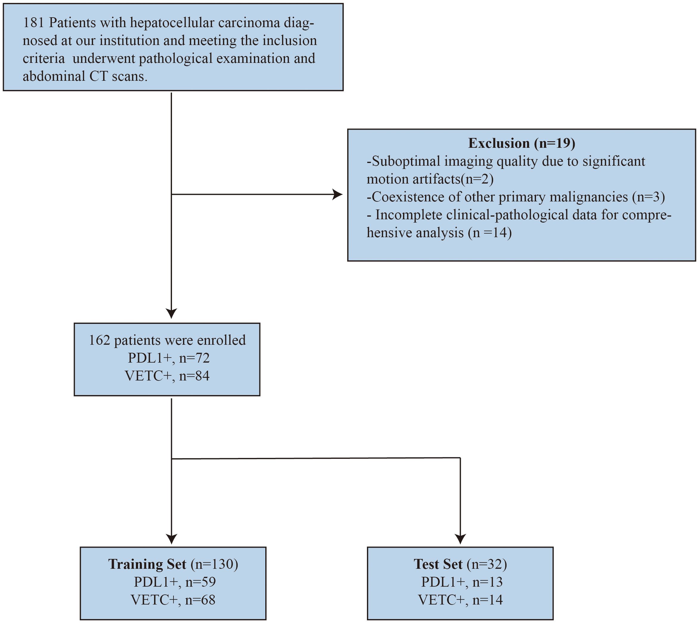The inclusion criteria were as follows: 1) histologically confirmed HCC with available PD-L1 and VETC expression assessment via histopathology after resection; 2) complete abdominal triple-phase imaging data available, with an interval of less than 2 weeks between pathology and imaging examinations; 3) treatment-naive status (no prior surgical, interventional, or systemic treatment) before surgical resection and imaging examination; and 4) complete clinical and laboratory data available.