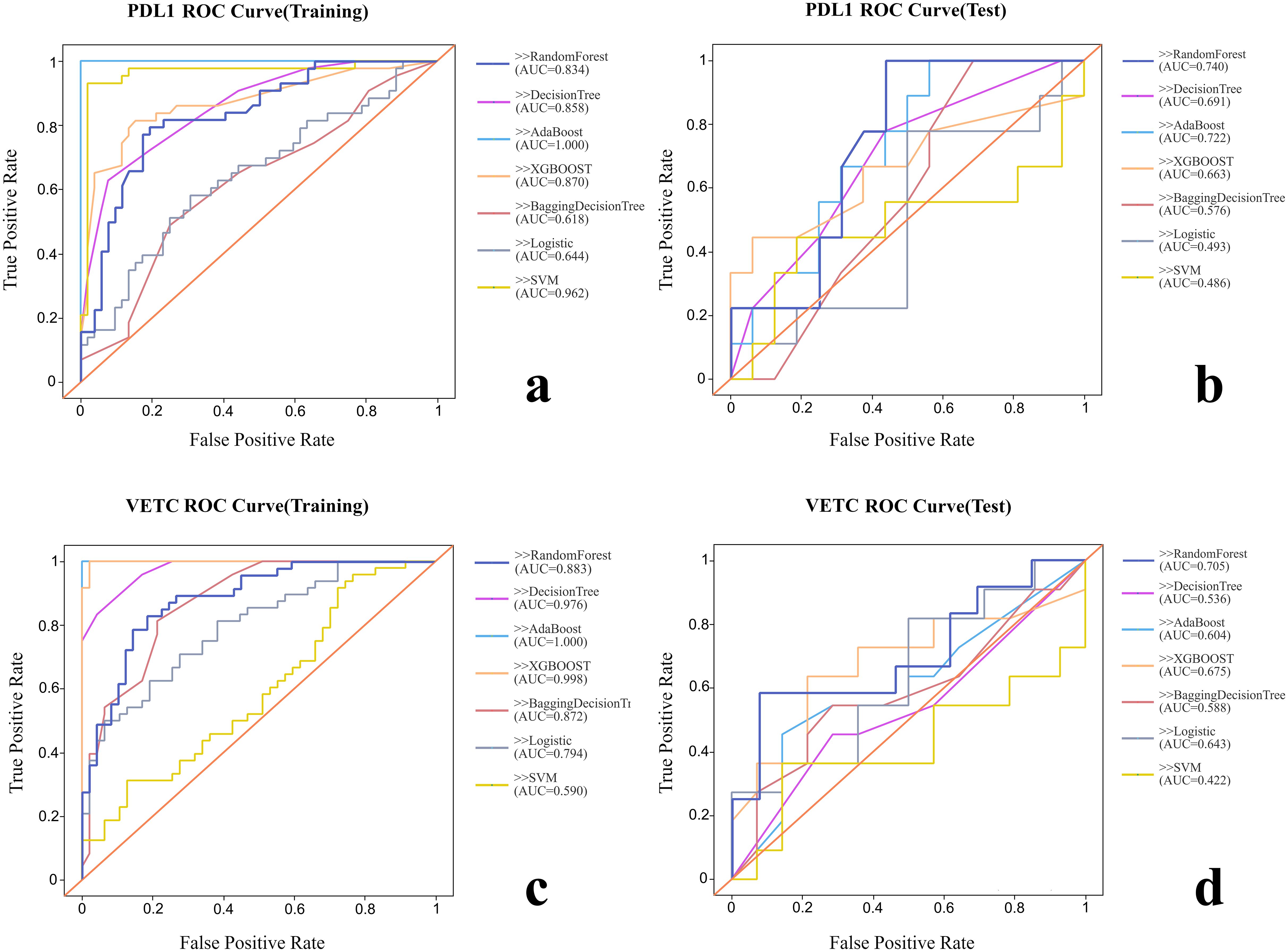 Figure 2. Comparison of the ROC curves of each radiomic model. (A) ROC curve of training group for PD-L1. (B) ROC curve of test group for PD-L1. (C) ROC curve of training group for VETC. (D) ROC curve of test group for VETC.