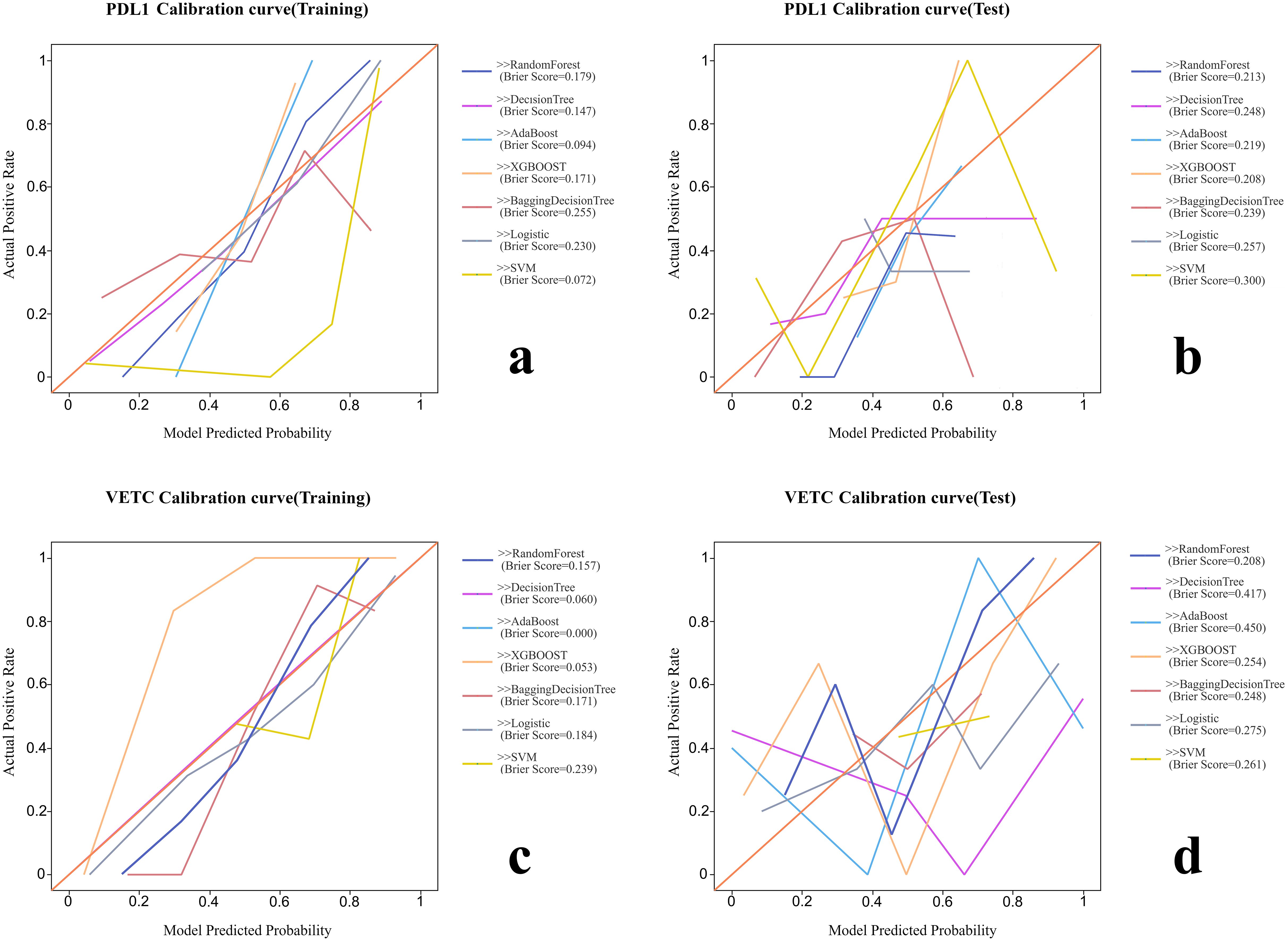 Figure 3. The calibration curves and Brier scores of each radiomic model. (A) Calibration curve of training group for PD-L1. (B) Calibration curve of test group for PD-L1. (C) Calibration curve of training group for VETC. (D) Calibration curve of test group for VETC.