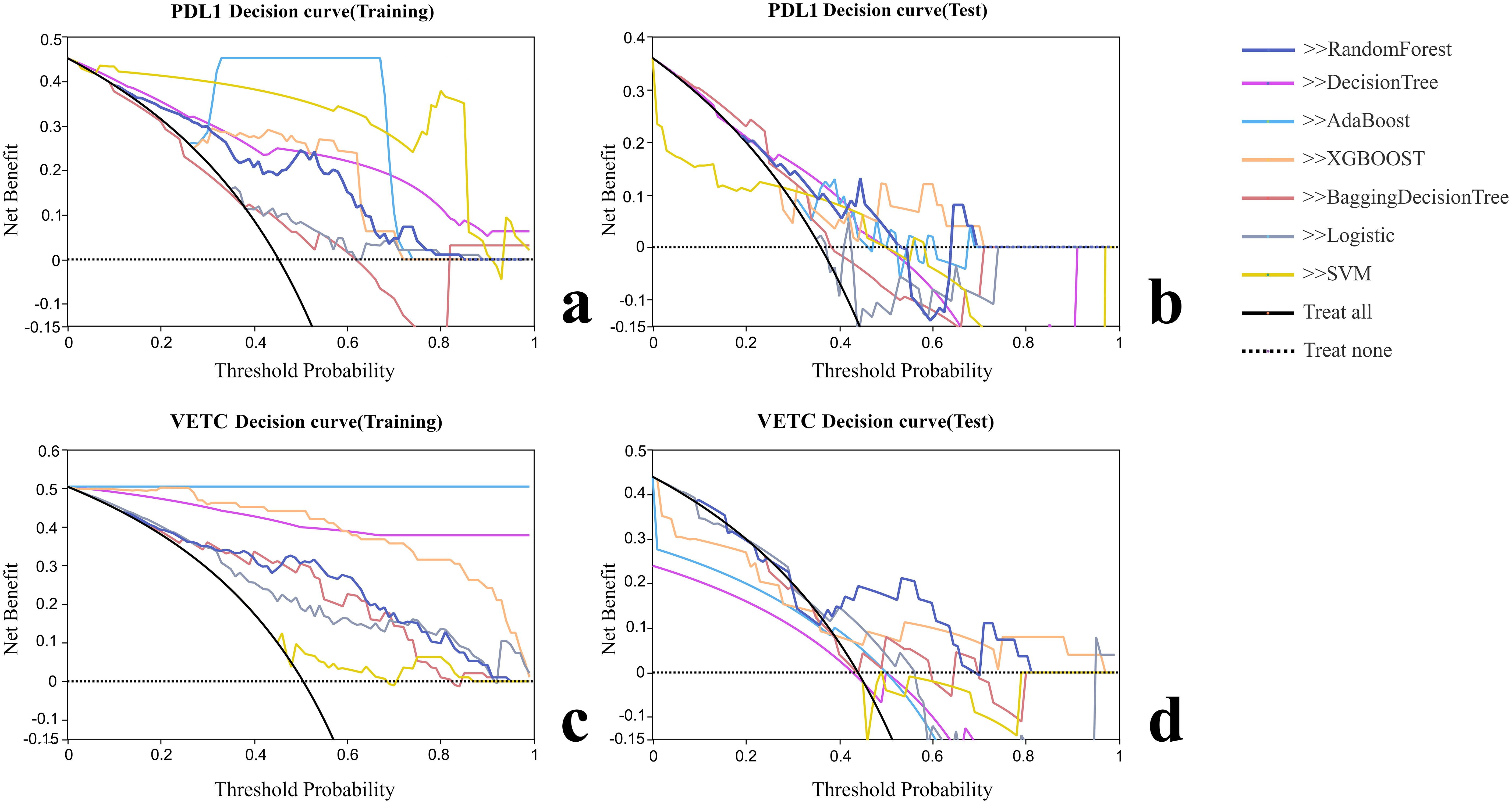 Based on the Radscore, a radiomic model was constructed using machine learning algorithms such as AdaBoost (AB), Bagging Decision Tree (BDT), Decision Tree (DT), Logistic Regression (LR), Random Forest (RF), Support Vector Machine (SVM), and eXtreme Gradient Boosting (XGBOOST). Receiver Operating Characteristic (ROC) curves were plotted. The area under the curve (AUC) was used to evaluate the model’s predictive accuracy for PD-L1 and VETC. Decision Curve Analysis (DCA) was used to calculate the net benefit for patients at various threshold probabilities, assessing the clinical utility of each model.