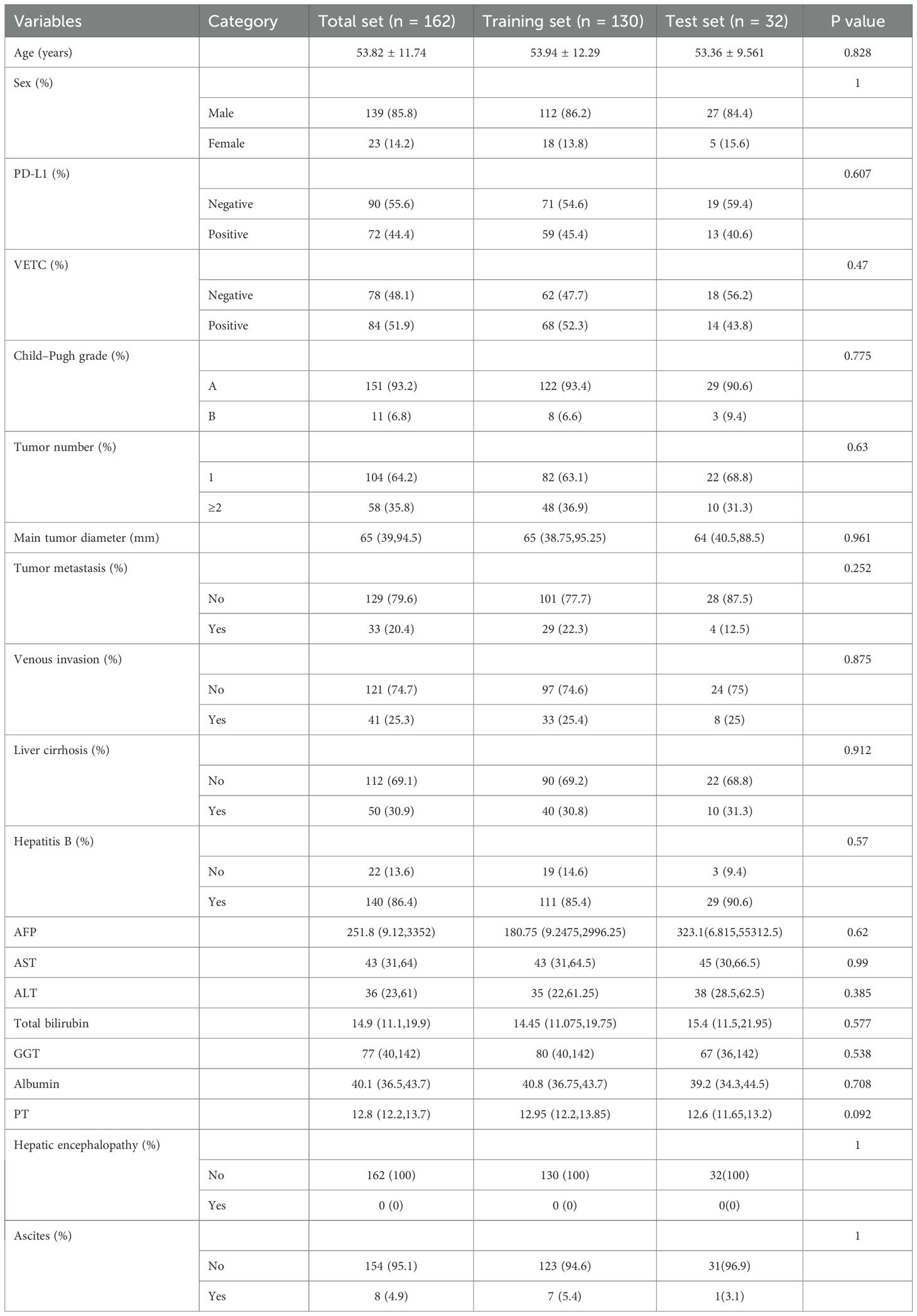 This study included 162 patients (male, n = 139; mean age 53.82 ± 12.29), among whom 72 (44.4%) were PD-L1 positive and 84 (51.9%) were VETC positive. Patients were randomly allocated in an 8:2 ratio to the training set (PD-L1+, n = 59, 45.4%; VETC+, n = 68, 52.3%) and test set (PD-L1+, n = 13, 40.6%; VETC+, n = 14, 43.8%). There were no significant differences in the clinical characteristics between the training and test sets (Table 1).