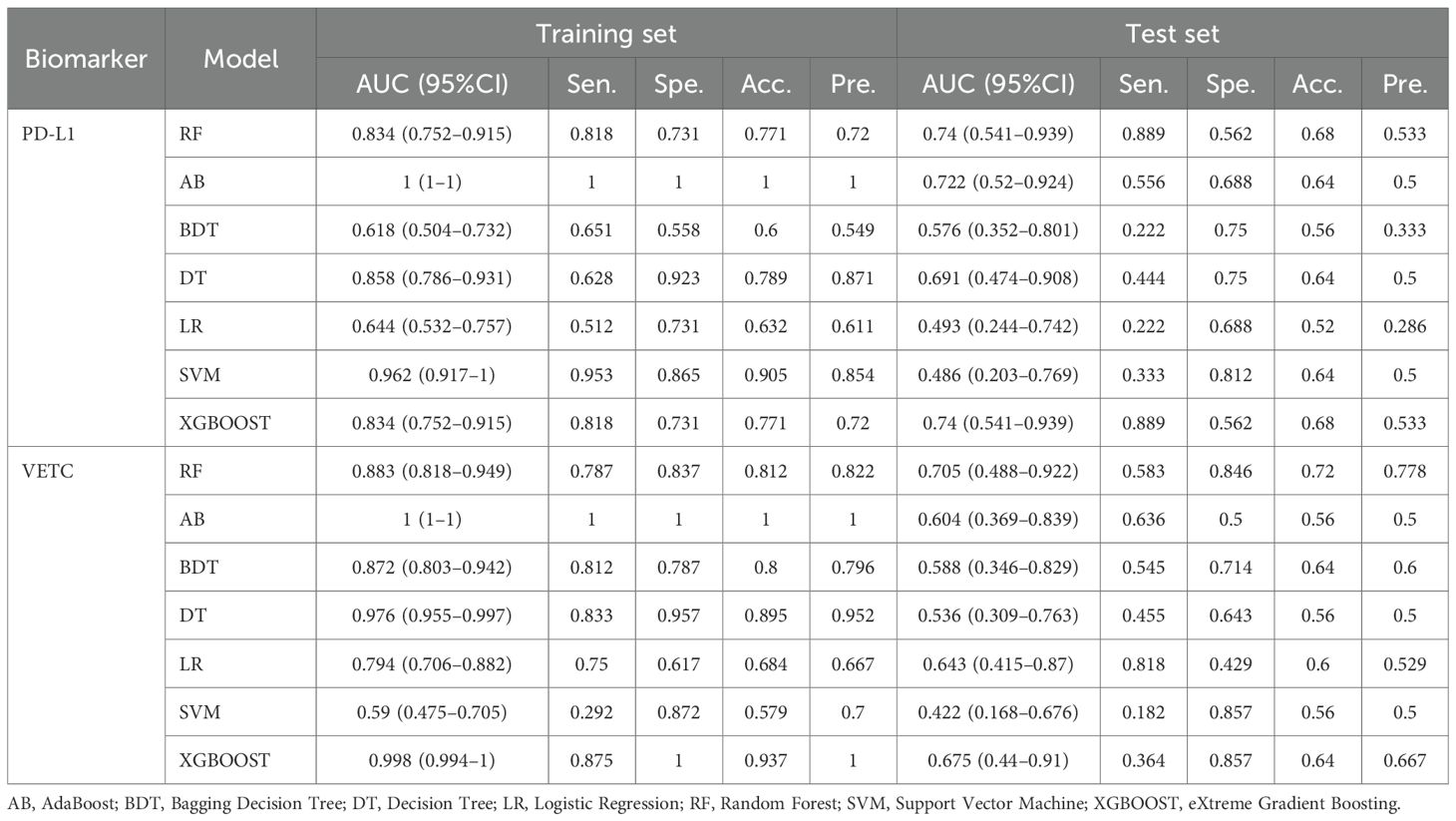 Various radiomic models, including AB, BDT, DT, LR, RF, SVM, and XGBOOST, were used to predict PD-L1 and VETC, and the performance of each model was evaluated (Table 2, Figure 2). Among them, the RF model demonstrated the best performance, with an AUC of 0.834 (95% CI: 0.752–0.915) for PD-L1 prediction in the training set and 0.740 (95% CI: 0.541–0.939) in the test set. For VETC prediction, RF achieved an AUC of 0.883 (95% CI: 0.818–0.949) in the training set and 0.705 (95% CI: 0.488–0.922) in the test set. To assess the calibration and usefulness of the models, calibration curves and decision curve analyses (DCA) were calculated, and the results are shown in Figures 3, 4. The Hosmer–Lemeshow test (P >0.05) and Brier Score indicated a good model fit for the RF model.
