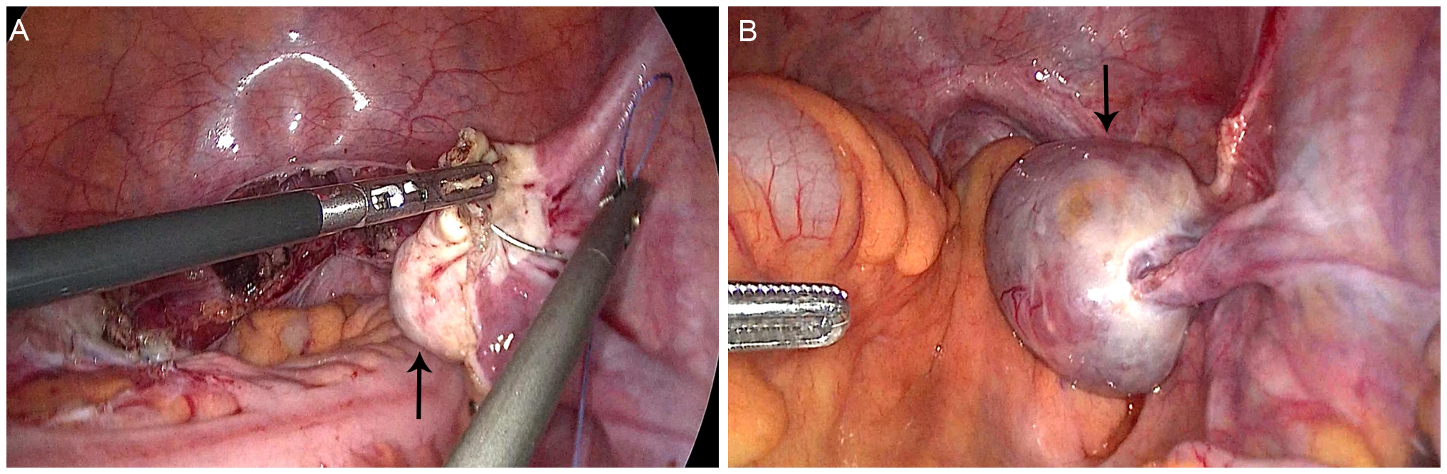 Morphology of the right ovary during two laparoscopic surgeries. (A) Normal appearance of the right ovary in the first surgery (arrow); (B) Enlarged right ovary with a cystic-solid tumor in the second surgery (arrow).
