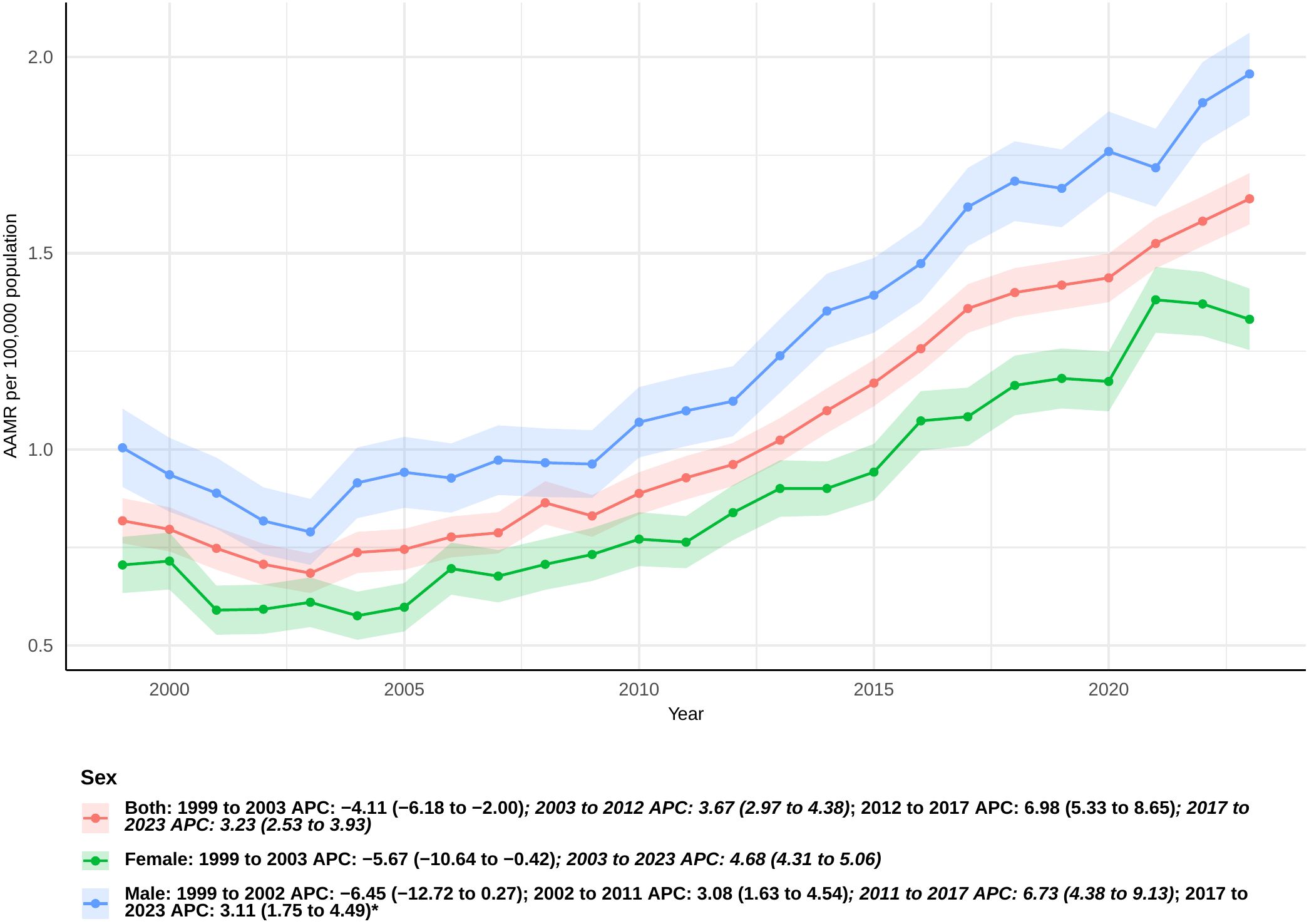 For males, the AAMR exhibited a non-significant decline from 1999 to 2002 (APC: -6.45 [95% CI: −12.72 to 0.27]). There were big jumps in the years 2002–2011, 2011–2017, and 2017–2023, with APCs of 3.08 (95% CI 1.63 to 4.54), 6.73 (95% CI 4.38 to 9.13), and 3.11 (95% CI 1.75 to 4.49), respectively (Figure 1). The overall AAPC for men was 2.73, with a 95% confidence interval of 1.61 to 3.87 (Supplementary Table 2).