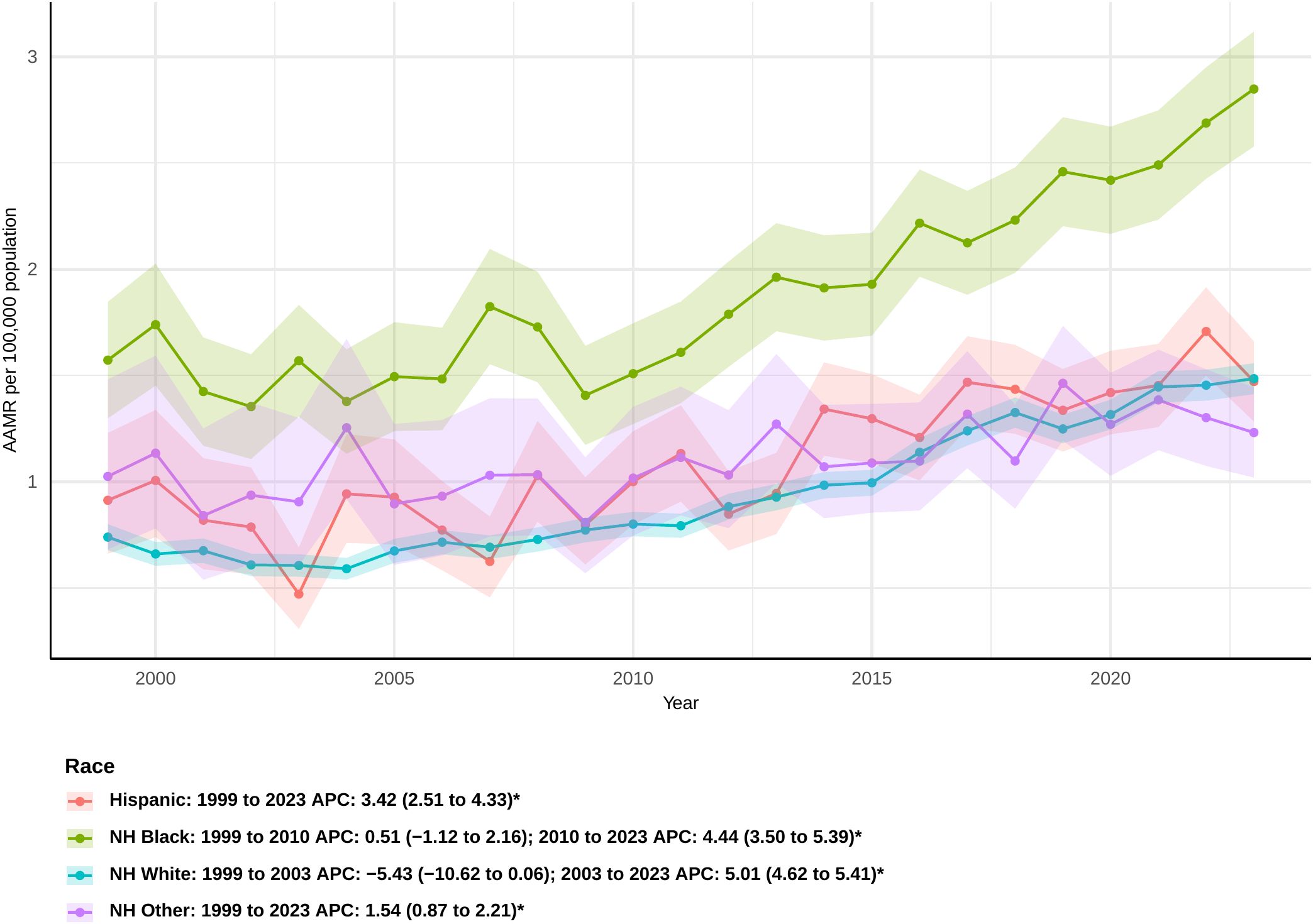 When the data were analyzed by race, non-Hispanic Black or African American participants demonstrated a markedly elevated AAMR during the study period, yielding an overall AAPC of 2.62 (95% CI: 1.76 to 3.48) (Supplementary Table 2). The rate did go up from 1999 to 2010, but this shift was not statistically significant (APC: 0.51 [95% CI: −1.12 to 2.16]) (Figure 2). But from 2010 to 2023, there was a clear rising tendency (APC: 4.44 [95% CI: 3.50 to 5.39]).Hispanic or Latino persons exhibited a steady rise in sepsis-related mortality, with the most significant increase noted among all racial categories (AAPC: 3.42 [95% CI: 2.51 to 4.33]). For non-Hispanic other people, the increase was the smallest, with an overall AAPC of 1.54 (95% CI: 0.87 to 2.21). From 1999 to 2003, the death rate for non-Hispanic White people went down, although this was not statistically significant (APC: -5.43 [95% CI: −10.62 to 0.06]). After that, it went up significantly until 2023 (APC: 5.01 [95% CI: 4.62 to 5.41]). Overall, the AAPC for this group was 3.19 (95% CI: 2.24 to 4.16), indicating a consistent upward trend in mortality.