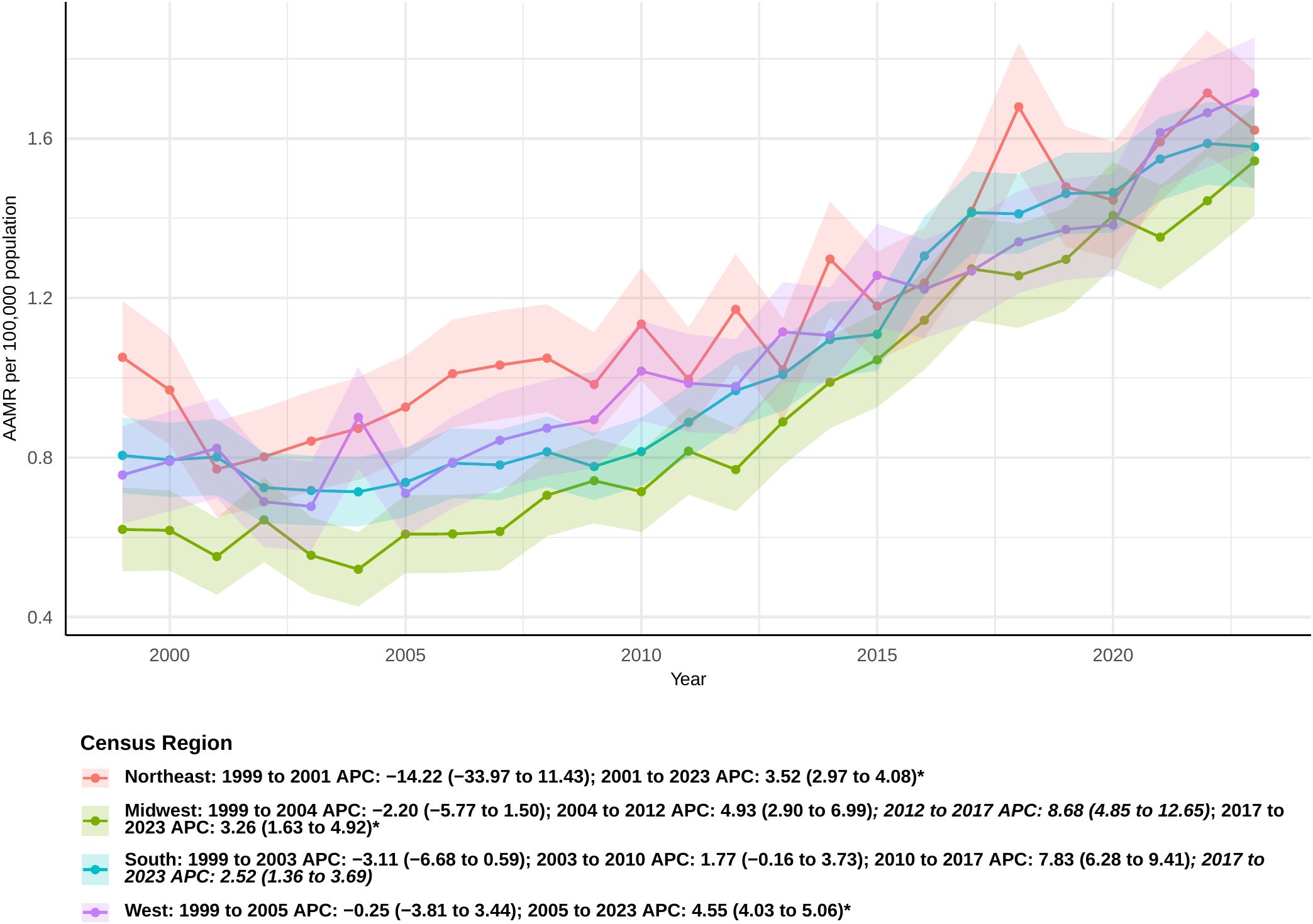 Figure 3. Joinpoint model of sepsis among middle-aged and elderly patients with pancreatic cancer AAMR per 100,000 residents by census regions, 1999-2023.Temporal trend segments are represented by APC values. (*APC Significant. APC, annual percentage change; AAMR, age-adjusted mortality rate).
