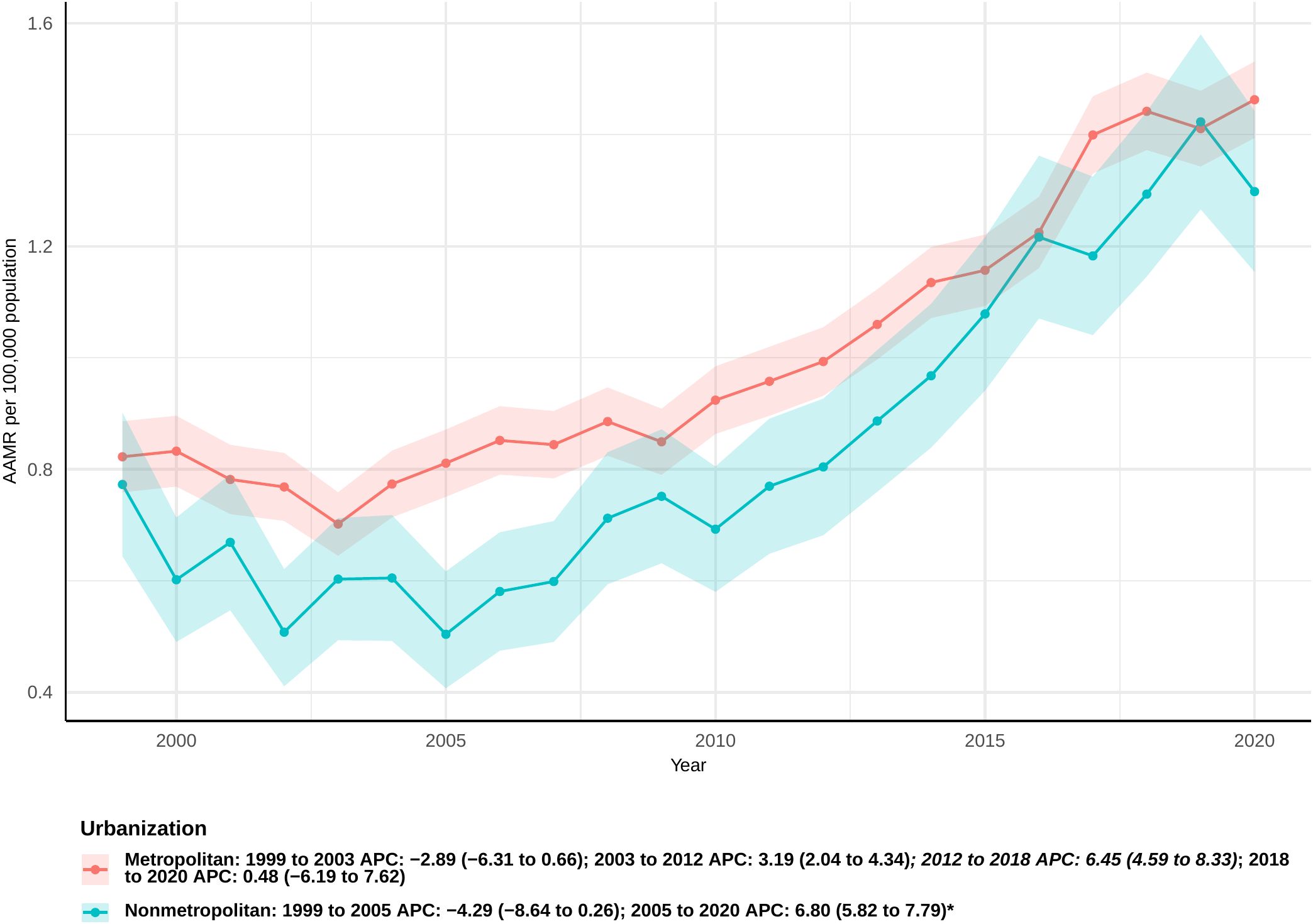 During the study period, the AAMR for urban populations remained consistently the highest, while rural populations experienced the most significant increase in the AAPC. Among urban populations, a downward trend was observed from 1999 to 2003, followed by an upward trend from 2018 to 2020; however, neither trend was statistically significant (APC: −2.89 [95% CI −6.31 to 0.66] and 0.48 [95% CI −6.19 to 7.62], respectively). Notably, significant increases were observed during the periods from 2003 to 2012 and from 2012 to 2018, with APCs of 3.19 (95% CI 2.04 to 4.34) and 6.45 (95% CI 4.59 to 8.33), respectively (Figure 4). The overall AAPC for urban populations was 2.65 (95% CI: 1.59 to 3.73) (Supplementary Table 2).