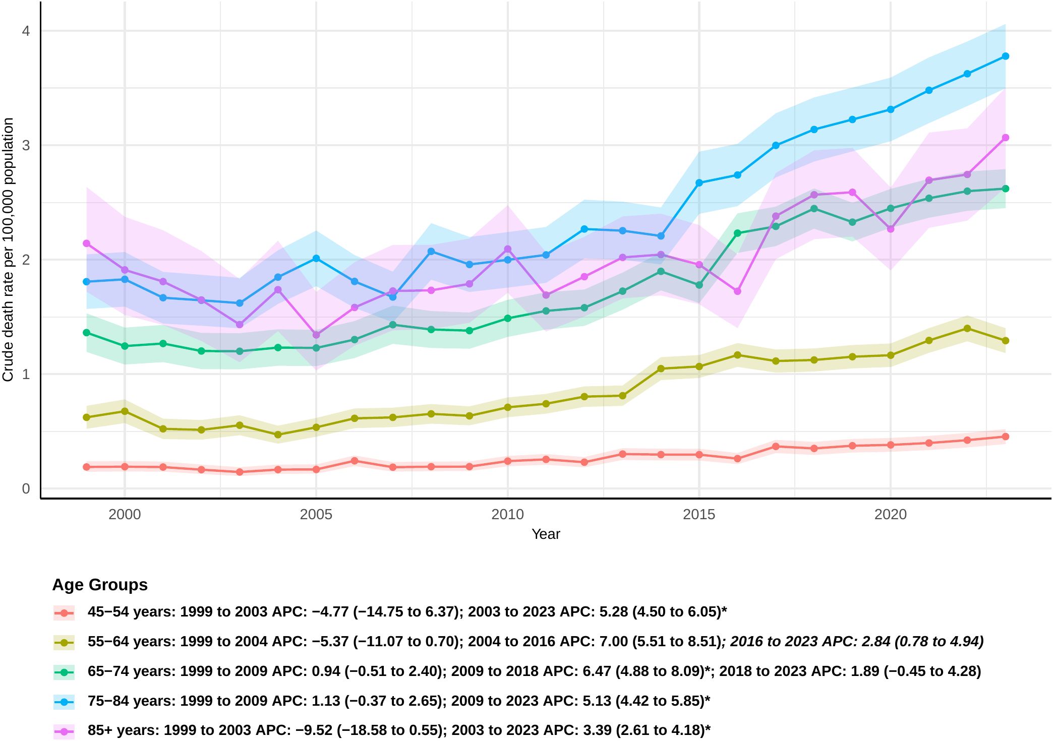The overall mortality rate increased across all age groups. Among individuals aged 45-54, a significant increase in mortality was observed from 2003 to 2023 (APC: 5.28; 95% CI 4.59 to 8.33). Although this age group represents the smallest cohort, it showed the largest overall increase in AAPC, with a value of 3.53 (95% CI: 1.66 to 5.44). A similar trend was noted in the 55–64 age group, where mortality rates rose steadily after 2004, leading to an AAPC of 3.10 (95% CI: 1.59 to 4.63). In the 65–74 age group, a sharp increase in mortality was observed from 2009 to 2018 [APC: 6.47 (95% CI: 4.88 to 8.09)], with an overall AAPC of 3.18 (95% CI: 2.27 to 4.10) (Figure 5). For individuals aged 75-84, the mortality rate significantly increased from 2009 to 2023 [APC: 5.13 (95% CI: 4.42 to 5.85)], and, from 2011 onwards, the AAMR in this group consistently remained higher than in other age groups. The 85 and older age group was the only group without a significant overall AAPC (Supplementary Table 2); however, a significant increase in mortality was observed from 2003 to 2023 (APC: 3.39 [95% CI: 2.61 to 4.18]).