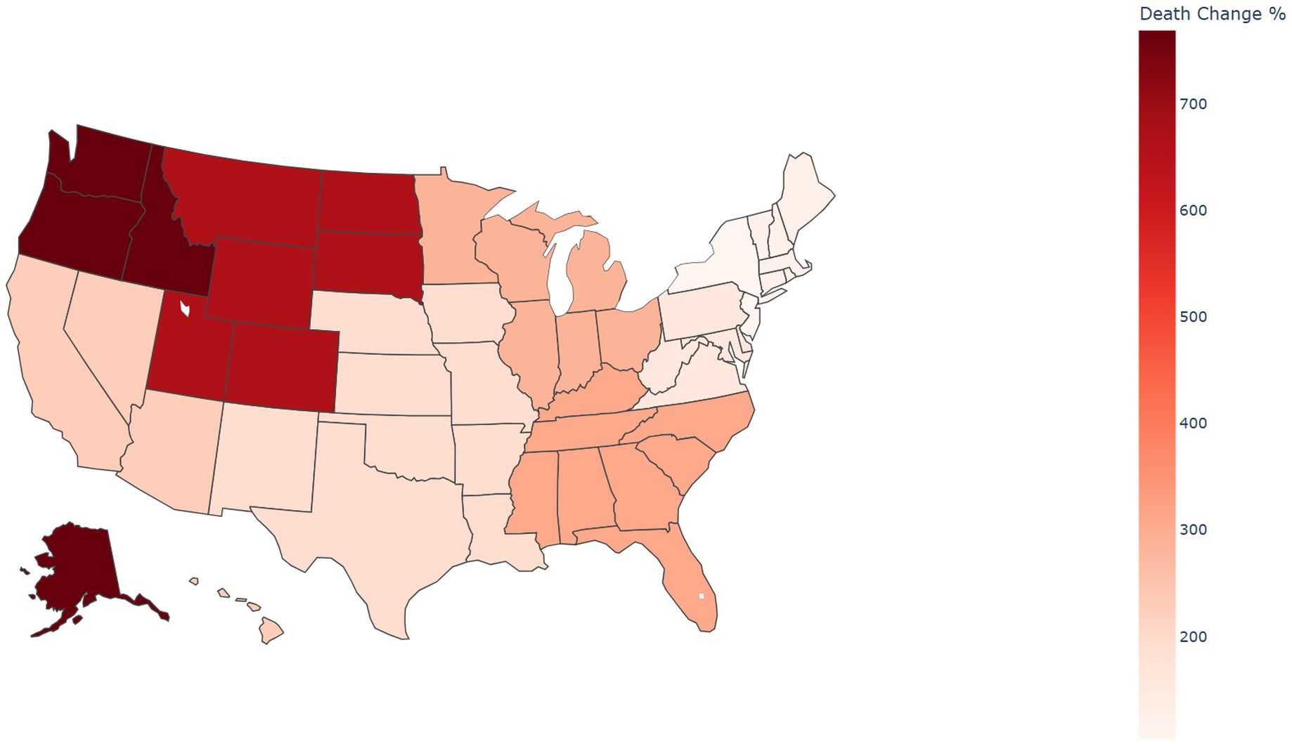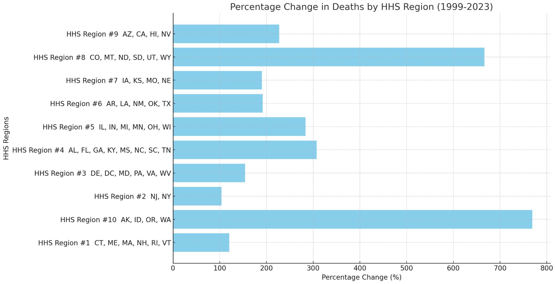 Due to sparse data or data labeled as ‘suppressed’ or ‘unreliable’ in certain states, which impacted the reliability of statistical results, the analysis was ultimately conducted by Health and Human Services (HHS) region. From 1999 to 2023, significant variations in the percentage change of sepsis-related mortality rates among pancreatic cancer patients were observed across the U.S. HHS regions(Supplementary Table 3). The region with the largest percentage change in mortality was HHS Region 10 (769.23%), which includes Alaska, Idaho, Oregon, and Washington. In contrast, the region with the smallest percentage change was HHS Region 2 (103.74%), encompassing New Jersey and New York(Figures 6, 7). Despite these regional differences, the percentage change in mortality rates showed an upward trend across all HHS regions.