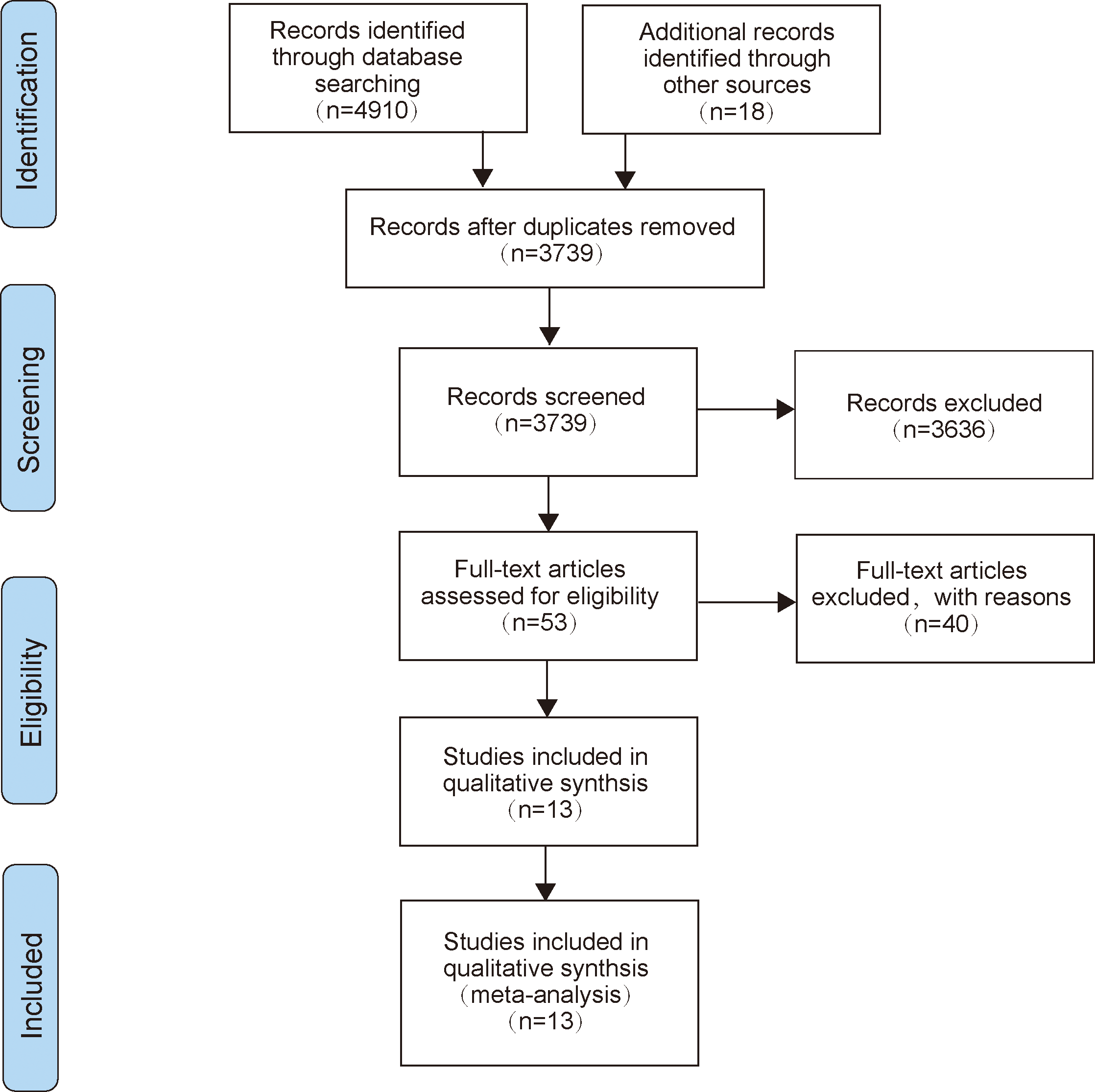 A total of 4,910 articles were retrieved through the search strategy, and 18 related reports were retrieved manually. A total of 3,739 articles were left after the elimination of duplicates. Subsequently, we scanned the titles and abstracts, leaving us with 53 articles that met the present inclusion criteria for full-text reading. Finally, 13 of these records were included in the final analysis (23–34). The specific research inclusion process was shown in Figure 1.