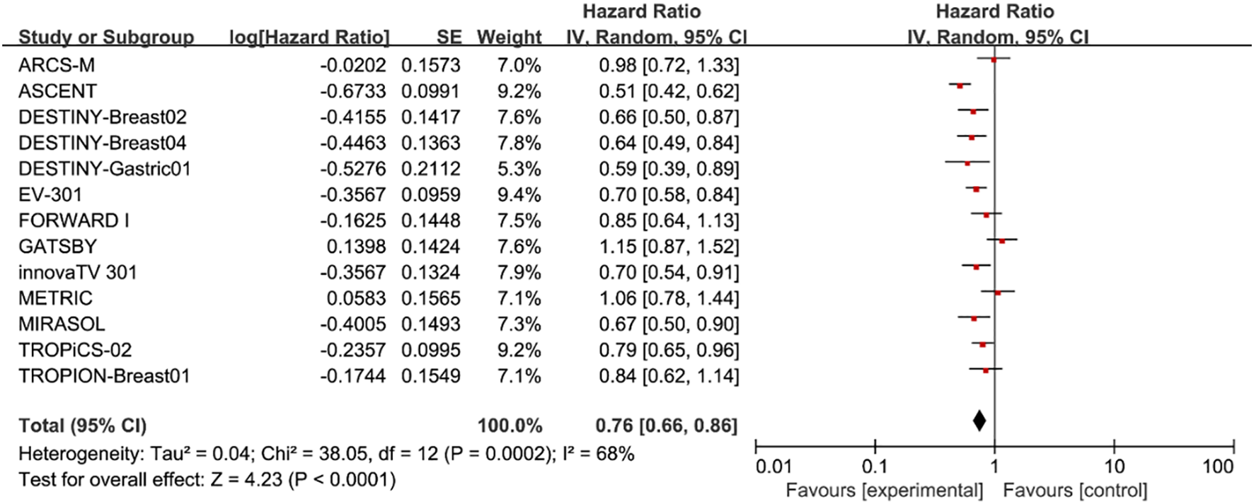In terms of OS, we found that patients treated with ADC drugs exhibited superior outcomes compared to those treated with chemotherapy drugs (HR = 0.76; 95% CI: 0.66-0.86, p < 0.0001, Figure 2). A random effects model was used (I² = 68%).
