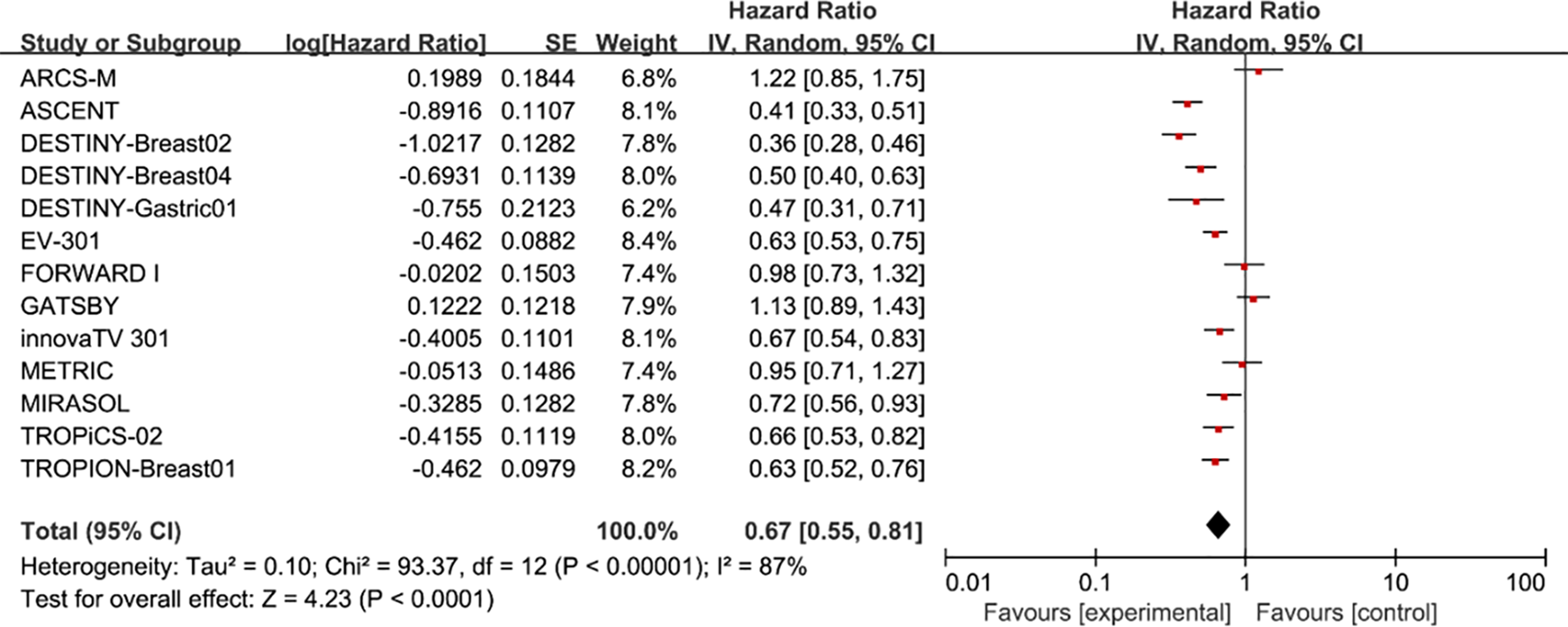 Pooled analysis of selected cases showed that PFS in the experimental group was improved (HR = 0.67, 95%CI: 0.55-0.81; p < 0.0001, Figure 3), using a random effects model (I2 = 87%).