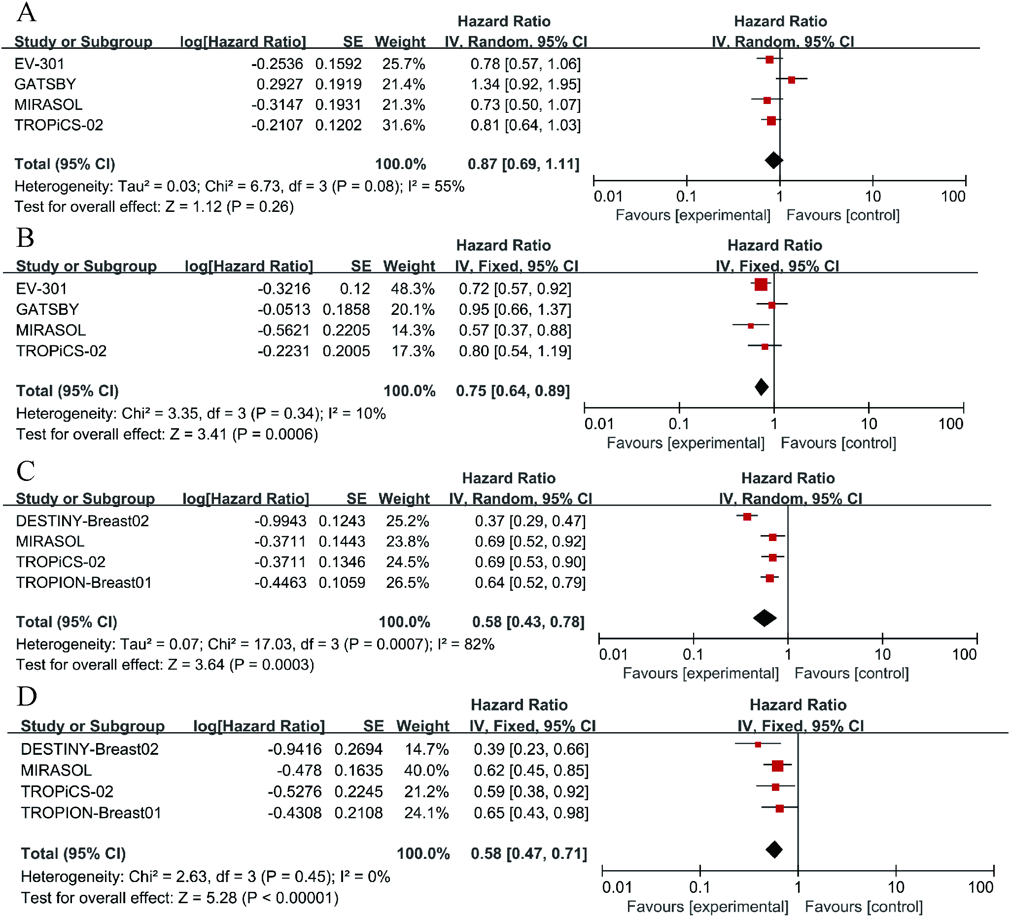 To further examine the heterogeneity of the data, subgroup analyses were conducted based on cancer type and ADC drug type, as illustrated in Figure 4. The results indicate that in each subgroup analysis, ADC drugs exhibited superior efficacy compared to chemotherapy drugs. However, heterogeneity in differences remained. Among breast cancer patients, ADC drugs demonstrated higher efficacy in terms of PFS (HR = 0.55, 95%CI: 0.43-0.71; p < 0.0001, Figure 5B) compared to OS (HR = 0.72, 95%CI: 0.59-0.89; p = 0.002, Figure 5A). When Trastuzumab deruxtecan (T-DM1) was compared with chemotherapy drugs, patients benefited more in PFS (HR = 0.61, 95%CI: 0.44-0.86; p = 0.005, Figure 5D) than in OS (HR = 0.73, 95%CI: 0.58-0.92; p = 0.009, Figure 5C). Similar results were also observed for the drug Sacituzumab govitecan (SG), where PFS (HR = 0.52, 95% CI: 0.33-0.83; p = 0.006, Figure 5F) demonstrated a greater benefit compared to OS (HR = 0.63, 95% CI: 0.41-0.97; p = 0.004, Figure 5E). Due to I² > 50, a random-effects model was used for all the above analyses. In the comparison between Mirvetuximab soravtansine (Elahere) and chemotherapy, patients in the Elahere group had a better OS (HR = 0.63, 95% CI: 0.62-0.93; p = 0.008, Figure 5G) than those in the chemotherapy group, analyzed using a fixed-effects model (I² = 24%). However, the statistical result for PFS was not significant, with P = 0.23. Furthermore, subgroup analysis by age was also conducted. Compared with chemotherapy, the survival advantage of ADCs remained consistent across different age groups (Figure 4). For patients under 65 years old, no statistically significant improvement was observed in OS (P = 0.26, Figure 4A); nevertheless, PFS showed significant improvement (HR = 0.75, 95% CI: 0.64–0.89; p = 0.0006, I² = 10%, Figure 4B). Similarly, among patients aged 65 years or older, significant benefits were observed in both OS (HR = 0.58, 95% CI: 0.43–0.78; p = 0.0003, I² = 82%, Figure 4C) and PFS (HR = 0.58, 95% CI: 0.47–0.71; p < 0.00001, I² = 0%, Figure 4D). These results suggest that the efficacy advantage of ADCs is maintained irrespective of patient age.