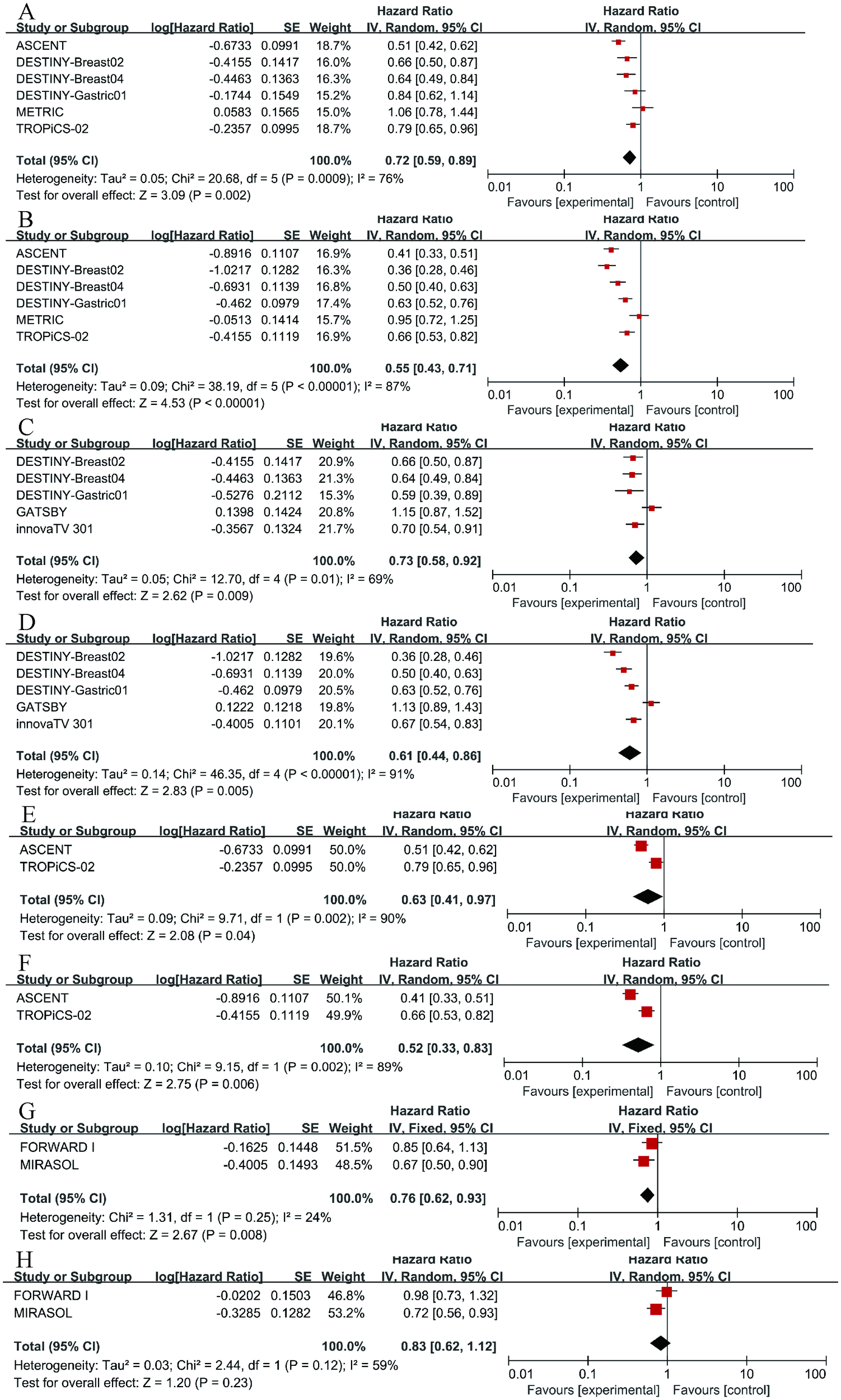 Forest plots comparing overall survival (OS) and progression-free survival (PFS) hazard ratios between ADC drugs and chemotherapy drugs. (A) OS in breast cancer. (B) PFS in breast cancer. (C) OS in Trastuzumab deruxtecan (T-DM1). (D) PFS in T-DM1. (E) OS in Sacituzumab govitecan (SG). (F) PFS in SG. (G) OS in Mirvetuximab soravtansine (Elahere). (H) PFS in Elahere.