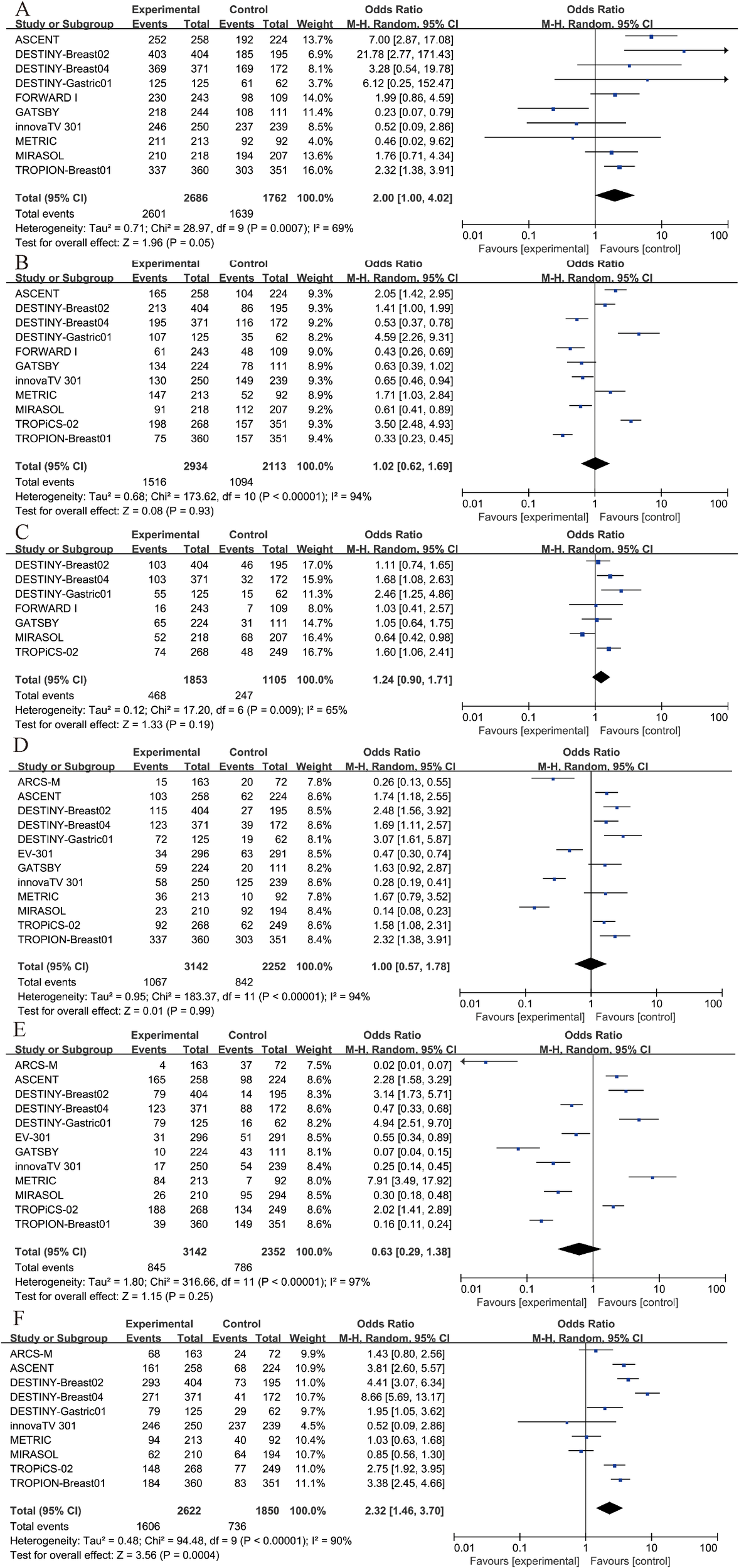 In conclusion, this meta-analysis indicates that ADCs provide significantly improved PFS and OS compared to conventional chemotherapy, while maintaining a generally acceptable safety profile in several malignant tumors. However, these benefits must be interpreted with caution due to significant heterogeneity across studies and variations in patient baseline characteristics. Our results support the use of ADCs as a valuable therapeutic option, particularly in refractory or relapsed settings. Further studies are warranted to refine patient selection, optimize combination strategies, and clarify long-term outcomes.