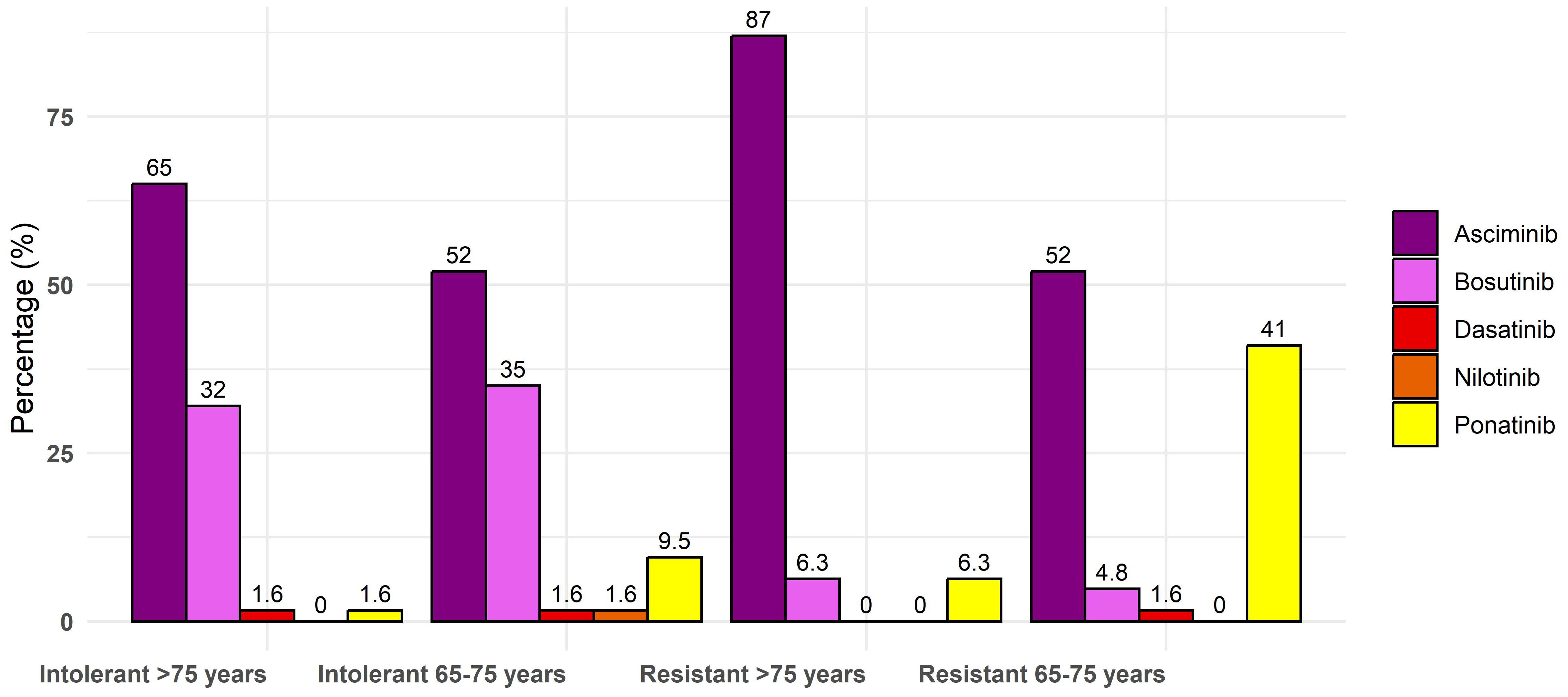 Considering the possible choice of asciminib as the third-line treatment after failure of imatinib and 2gen TKI, each class of age could benefit from the drug, in particular, very elderly patients aged >75 years (87% of preferred option, n = 55 vs. 6% only of bosutinib and ponatinib each). Indeed, in the subset of resistant patients aged 65–75, asciminib was chosen but without specific differences with ponatinib (52% vs. 41%), with only a few participants indicating dasatinib (1.6%) and bosutinib (4.8%). In truly intolerant patients of each class of age (65–75 or >75 years old), physicians preferred asciminib (Figure 2). In intolerant patients aged 65–75 years, asciminib could be preferred by 52% of participants compared to 35% for bosutinib, 9.5% for ponatinib, and 1.6% for nilotinib and dasatinib. In patients aged >75 years, asciminib was preferred by 65% of participants compared to 32% for bosutinib, 1.6% for ponatinib, and dasatinib. Asciminib was preferred also in patients with pre-existing cardiovascular comorbidities by 47 (75%) participants. In this setting, only six physicians (13%) preferred to use the drug at a reduced dose instead of 40 mg twice a day. More than 70% of physicians thought that asciminib could also be an option as a first-line treatment, and they were asked in which subset of patients: 17 (39%) believed that all patients could benefit regardless of the baseline profile and desired final endpoint, 12 (27%) believed that older patients are unfit for other treatments with 2gen TKIs, 10 (23%) believed that younger patients have a future treatment-free remission (TFR), and five (11%) believed that patients regardless of age should not be candidates for discontinuation. The main reason to prefer asciminib as a frontline treatment is due to its tolerability according to 34 (54%) physicians, its efficacy according to 13 (21%) physicians, possible faster responses according to five (7.9%) physicians, and the possible increased rate of discontinuation in the future according to 11 (17%) physicians.