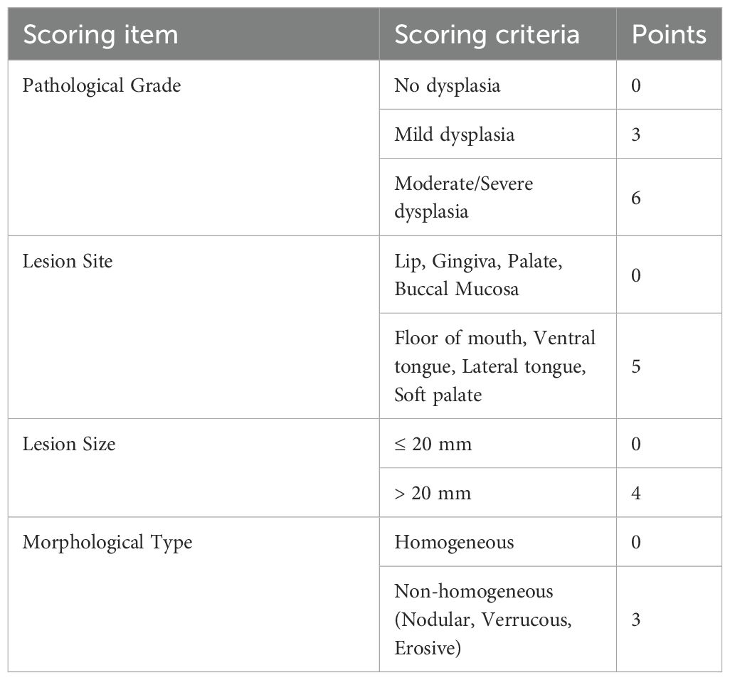 A scoring system was designed based on features associated with Proliferative Verrucous Leukoplakia (PVL) (10) (Table 1). Based on the total score, patients were stratified into Low-risk (0–4 points), Intermediate-risk (5–8 points), and High-risk (≥9 points) groups.