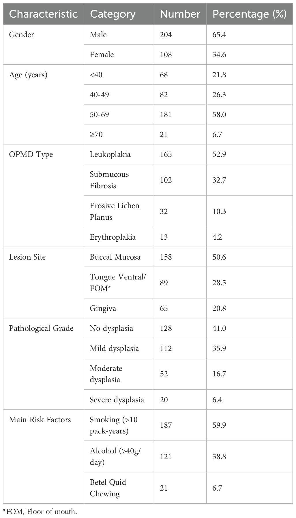 This study included 312 OPMD patients diagnosed between January 2017 and December 2022, with a mean follow-up time of 28.6 ± 9.3 months (range: 12–48 months). Patients were predominantly male (65.4%) and middle-aged or elderly (50–69 years, 58.0%). The main OPMD types were oral leukoplakia (52.9%) and Lichen planus (10.3%) (Figures 1A, B). 6.7% had a history of betel quid chewing (reflecting significant regional characteristics). Pathological biopsy revealed moderate to severe epithelial dysplasia in 23.1% of cases (Table 2) (Figure 1C).
