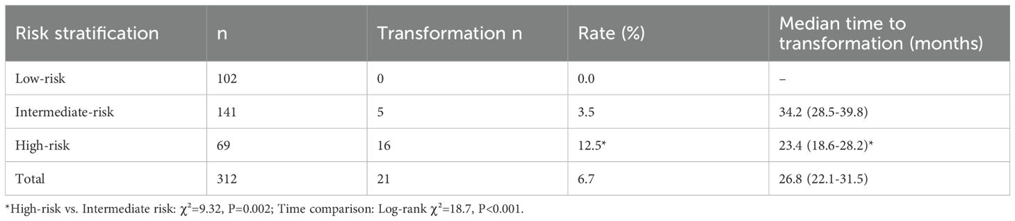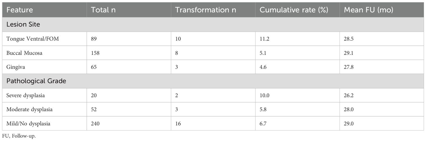 Stratification based on the modified PVL model resulted in: Low-risk group (n=102, 32.7%), Intermediate-risk group (n=141, 45.2%), and High-risk group (n=69, 22.1%). During follow-up, 21 cases underwent malignant transformation (overall transformation rate 6.7%) (Figures 1D). The transformation rate was significantly higher in the High-risk group (12.5% vs. 3.5% in Intermediate vs. 0% in Low-risk, P<0.001). The median time to transformation was significantly shorter in the High-risk group (23.4 months, 95% CI: 18.6-28.2) compared to the Intermediate-risk group (Log-rank χ²=18.7, P<0.001) (Table 3). Lesions located in the tongue ventral/floor of mouth had the highest transformation rate (11.2%), followed by those with severe dysplasia (10.0%) (Table 4). Notably, a specific high-risk subgroup was identified: patients with a history of betel quid chewing, lesions located in the tongue ventral/floor of mouth, and a pathological diagnosis of mild dysplasia (n=22). Despite the low pathological grade, their cumulative transformation rate was 9.1% (2/22). Based on this finding, all such patients were included in the high-risk management category.