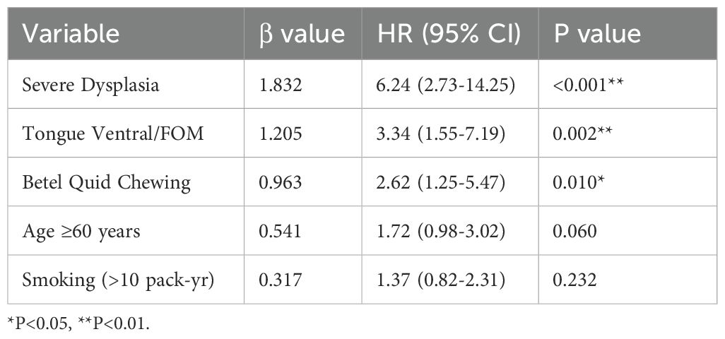 Multivariable Cox proportional hazards regression analysis identified the following independent risk factors for transformation: severe epithelial dysplasia (strongest predictor, HR = 6.24, 95% CI: 2.73-14.25, P<0.001); lesions located in the tongue ventral/floor of mouth (HR = 3.34, 95% CI: 1.55-7.19, P = 0.002); history of betel quid chewing (HR = 2.62, 95% CI: 1.25-5.47, P = 0.010). The model passed the Schoenfeld residual test (P = 0.32), indicating proportionality of hazards. The -2 Log Likelihood was 142.6 (Table 5).