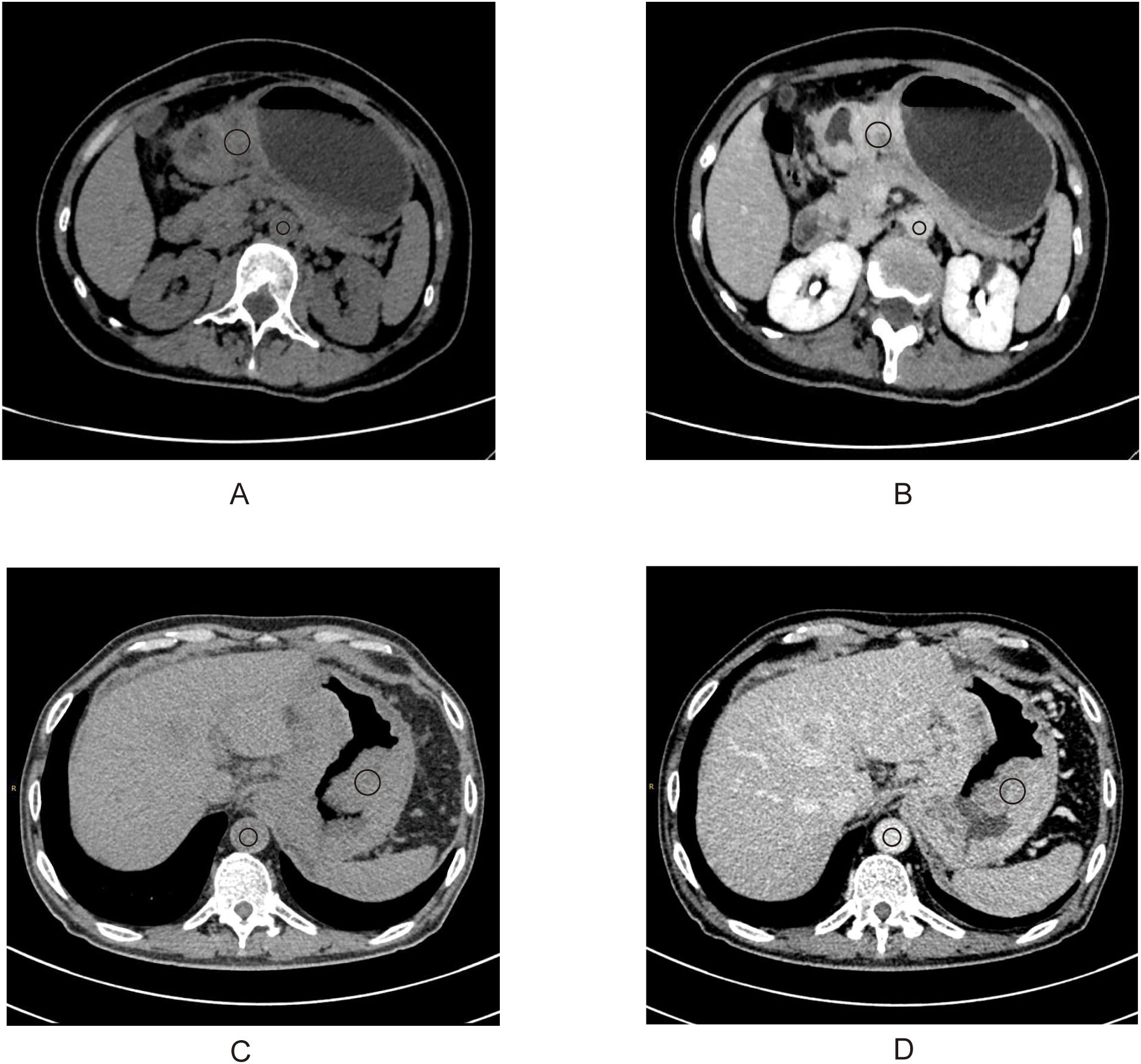 Figure 1. A 50-year-old woman with stage III gastric adenocarcinoma (A, B) and a 63-year-old man with stage IV gastric adenocarcinoma (C, D). Axial unenhanced (A, C); equilibrium-phase contrast-enhanced (B, D). The tumor extracellular volume fractions were 31.8% and 35.8%, respectively.