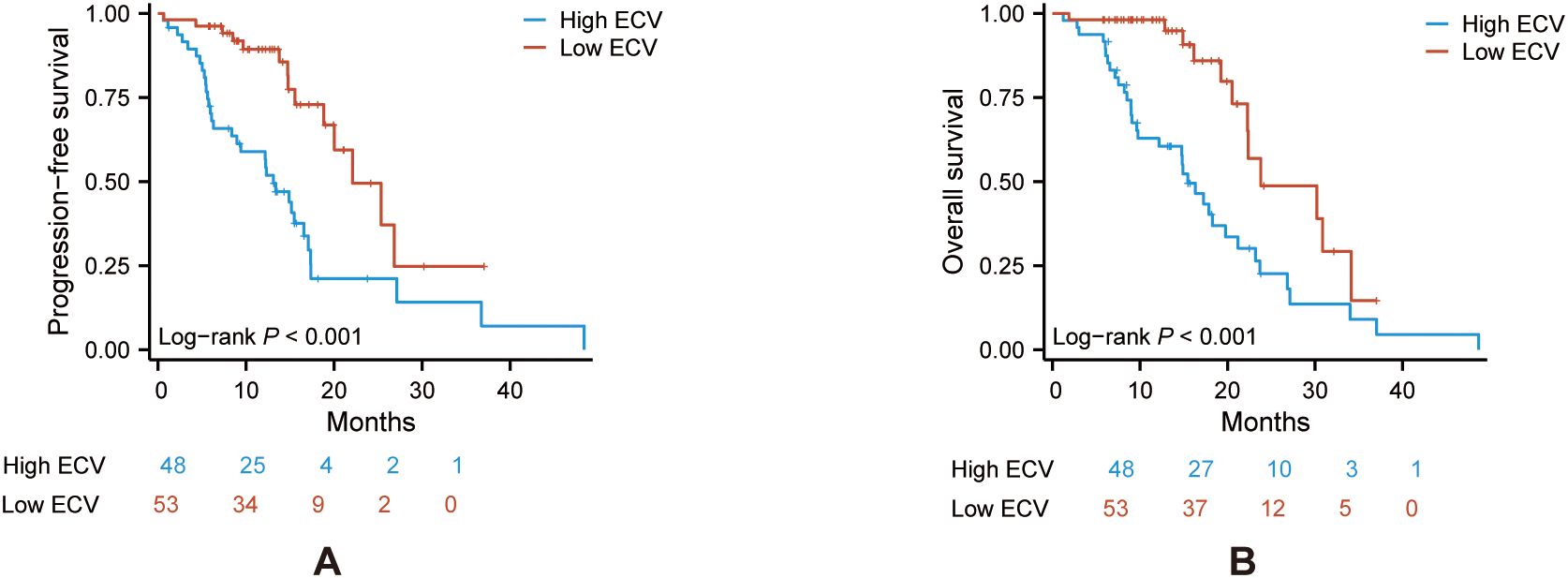 Results: Kaplan–Meier survival curves indicated that the ECV-higher group had shorter progression-free survival (PFS) (P < 0.001) and overall survival (OS) (P < 0.001) than the ECV-lower group. Multivariate Cox regression analysis confirmed that high CT-ECV was independently associated with worse PFS and OS (PFS: HR = 2.716, 95% CI: 1.432–5.152, P = 0.002 and OS: HR = 2.593, 95% CI: 1.322–5.084, P = 0.006).