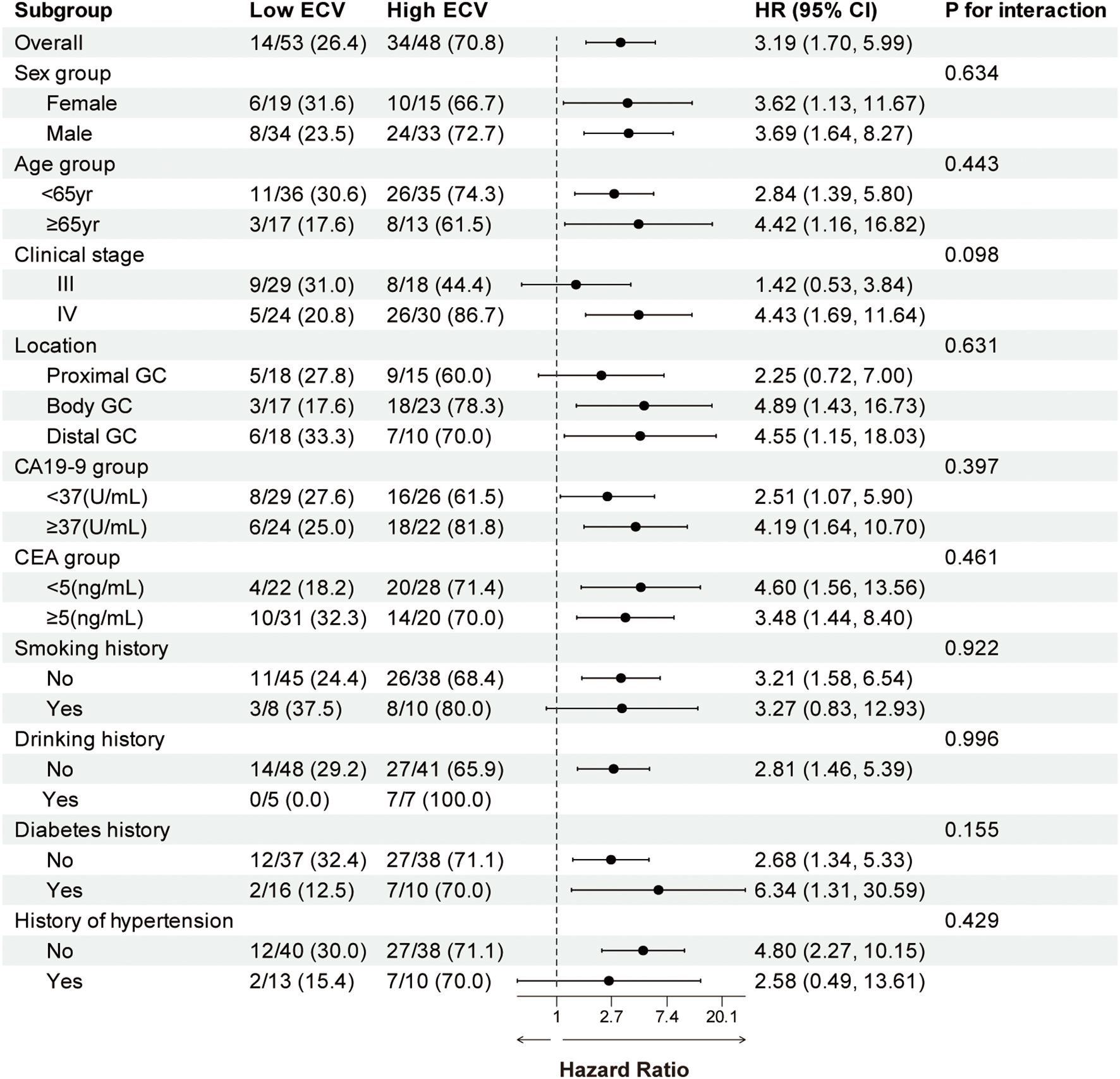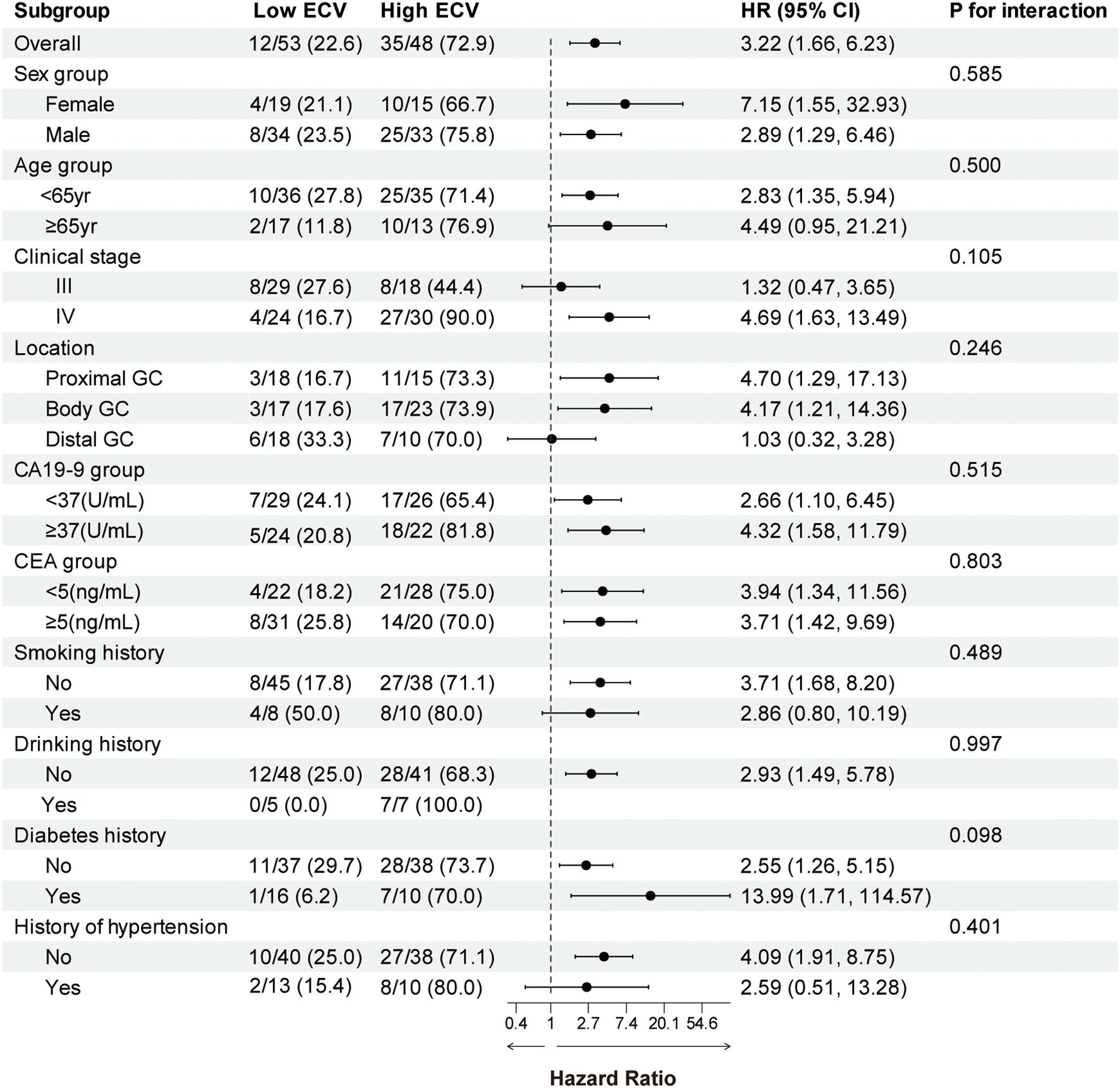 Figure 3. Forest plot of subgroup analysis in progression-free survival between the ECV-lower group and ECV-higher group. The dashed line indicates a hazard ratio of 1. ECV, extracellular volume fraction; HR, hazard ratio; CI, confidence interval; GC, gastric cancer; CA19-9, carbohydrate antigen 19-9; CEA, carcinoembryonic antigen.