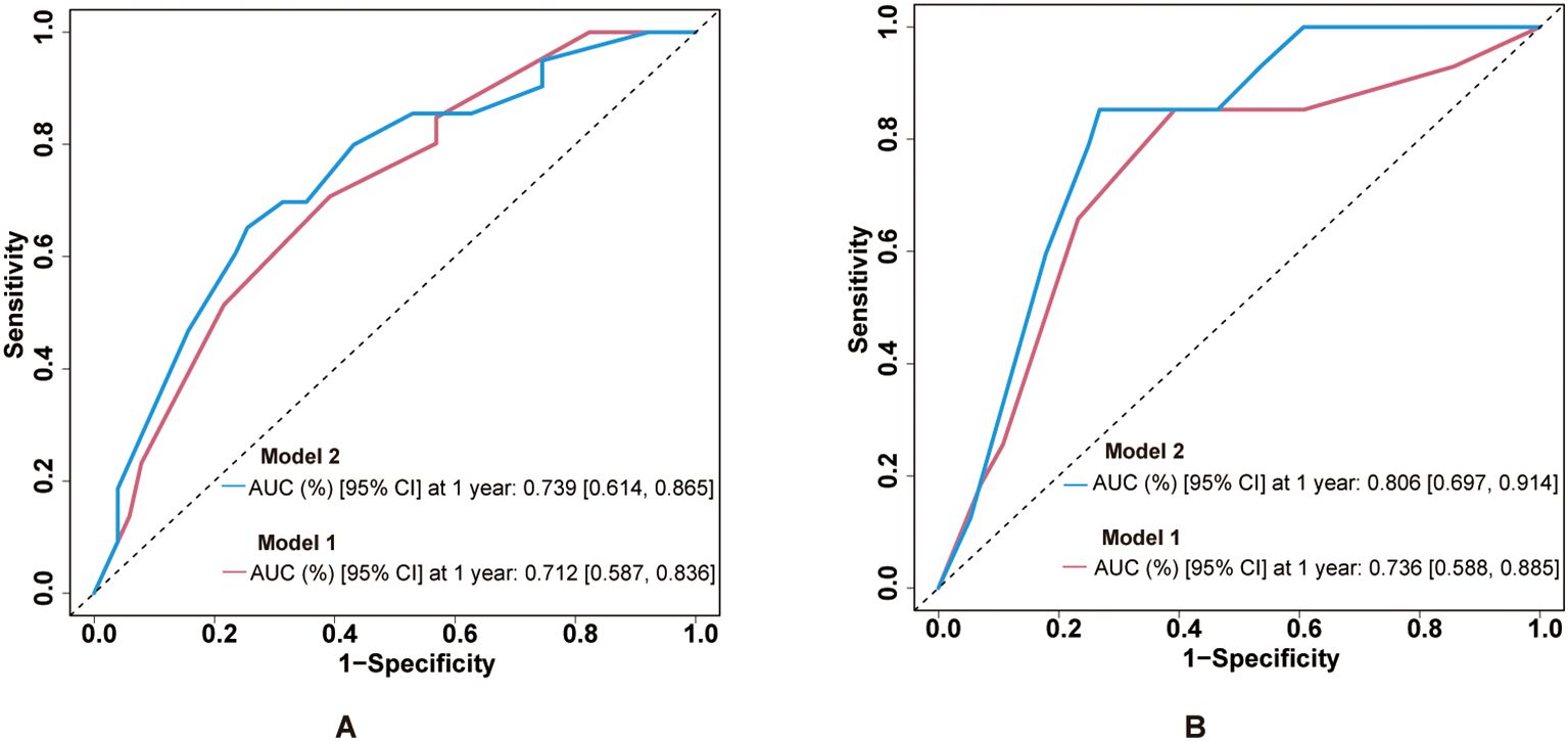 Figure 5. Predictive performance of ECV-integrated models. (A) ROC curves for PFS prediction comparing model 1 and model 2. AUC values are shown in the legend. (B) ROC curves for OS prediction with the same model comparisons. ECV, extracellular volume fraction; ROC, receiver operating characteristic; AUC, area under the curve; PFS, progression-free survival; OS, overall survival.