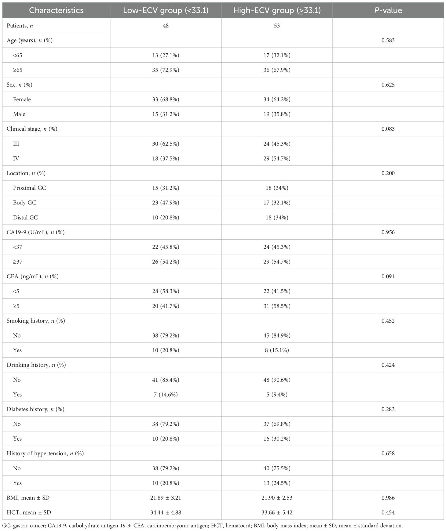 A total of 101 gastric adenocarcinoma patients were included in this study. The average age was 59.3 ± 11.9 years, with 66% being male. Based on the ECV indices and using X-tile, the optimal cutoff values were determined (33.1). There were 48 patients in the low-ECV group (<33.1) and 53 patients in the high-ECV group (≥33.1). No significant differences were observed in age, sex distribution, clinical stage, tumor location, tumor markers, HCT, BMI, risk factors, or other comorbidities (Table 1).