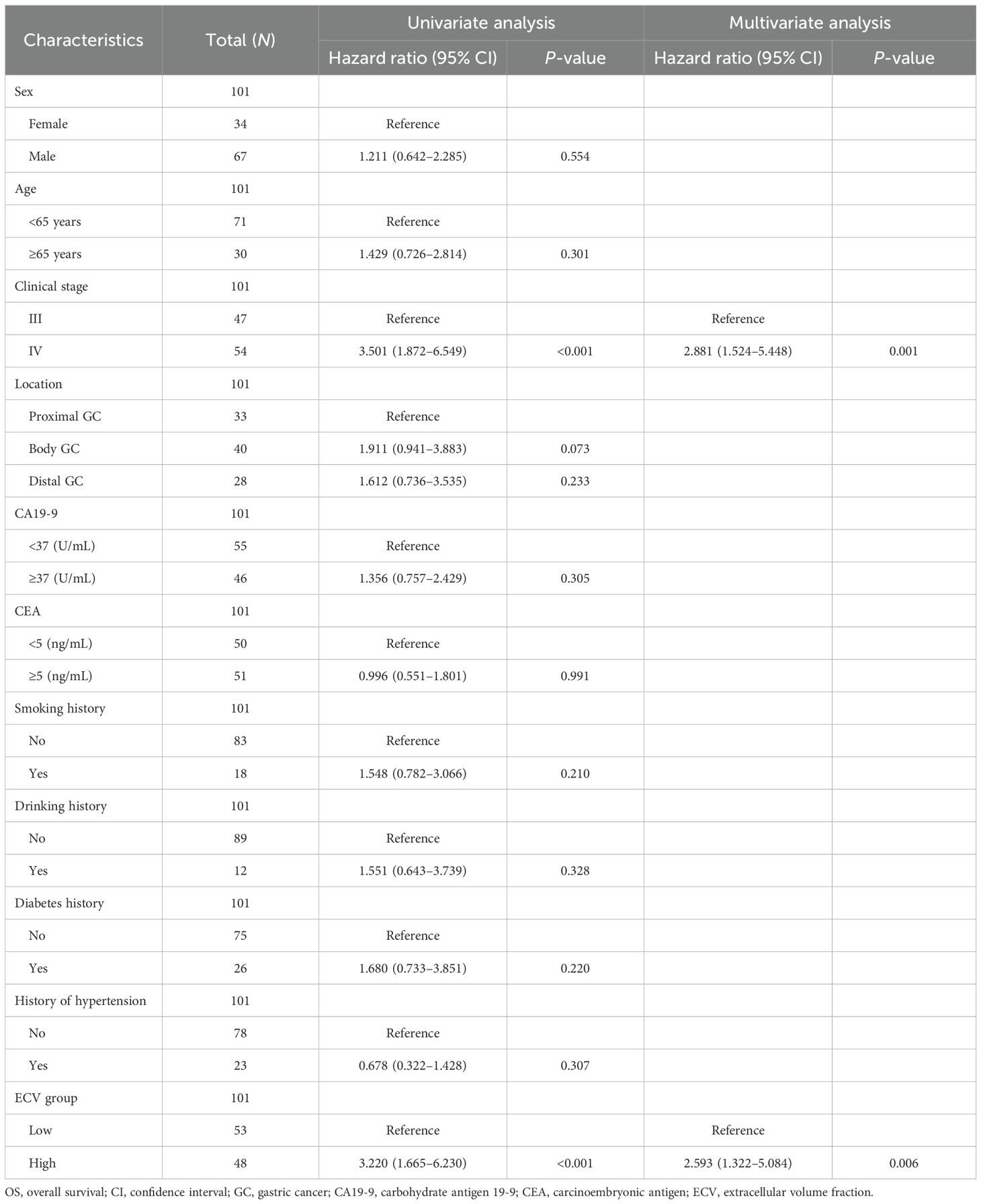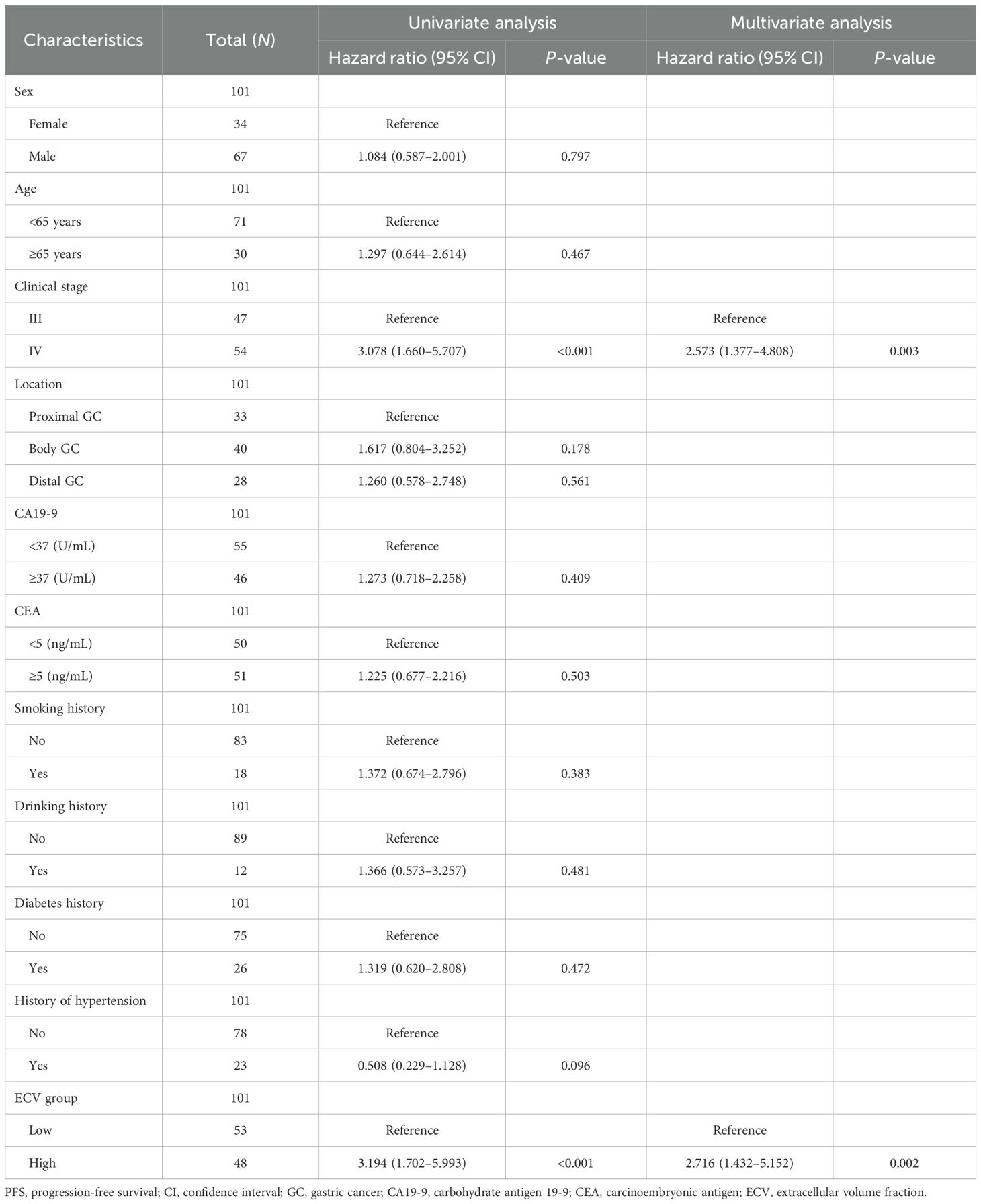 Univariate analysis showed that high ECV significantly predicted a shorter progression-free survival (PFS: HR = 3.194, 95% CI: 1.702–5.993, P < 0.001), and clinical stage IV was associated with reduced PFS (HR = 3.078, 95% CI: 1.660–5.707, P < 0.001). For OS, high ECV and clinical stage IV showed a stronger prognostic value (HR = 3.220, 95% CI: 1.665–6.230, P < 0.001; HR = 3.501, 95% CI: 1.872–6.549, P < 0.001).
