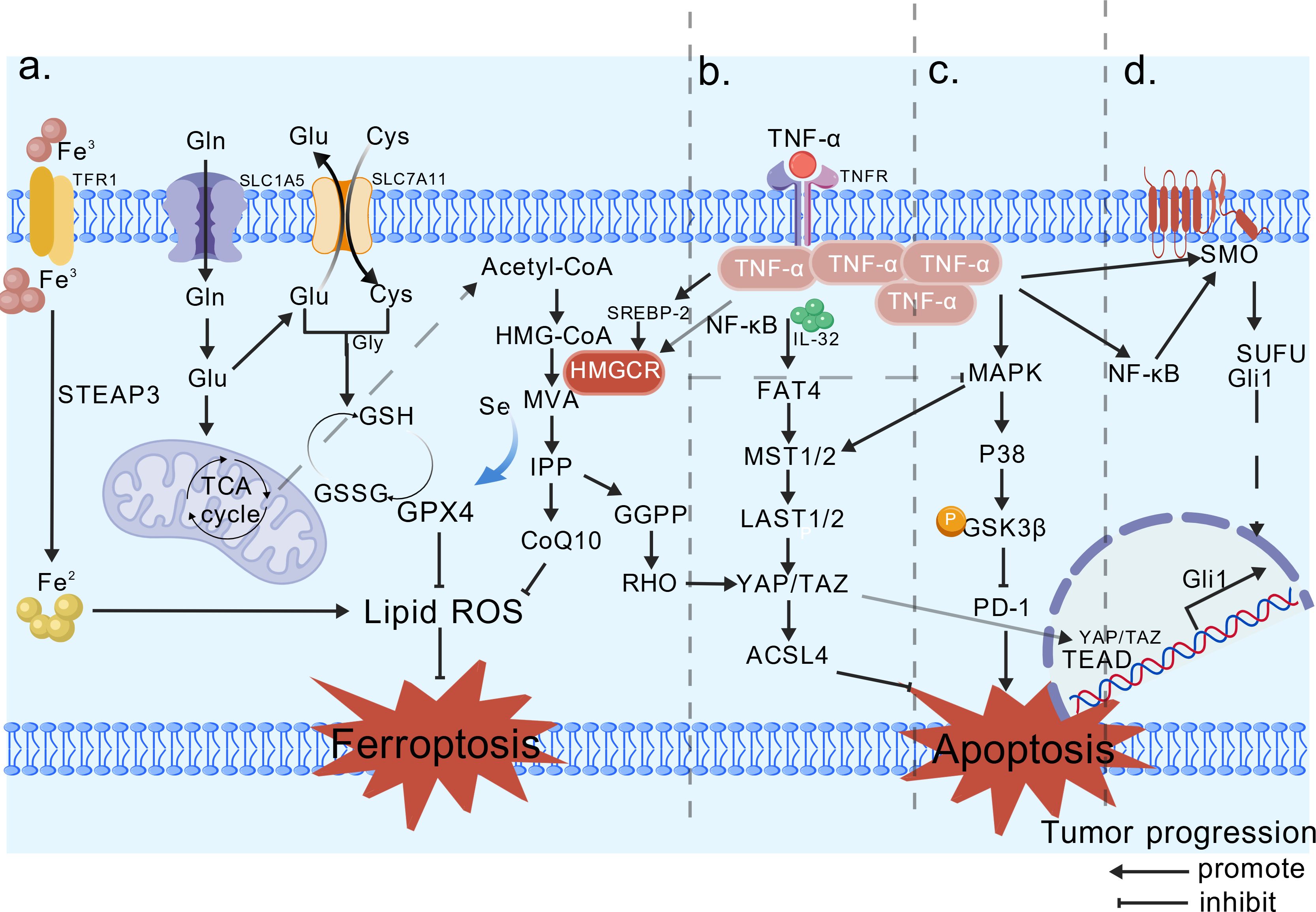 HMGCR, 3-Hydroxy-3-methylglutaryl coenzyme A reductase; TNF-α, Tumor necrosis factor-alpha; SREBF-2, Sterol regulatory element-binding protein 2; HMG-CoA, 3-hydroxy-3-methyl glutaryl coenzyme A; ROS, Reactive oxygen species; GPX4, Glutathione Peroxidase 4; SLC7A11, Solute Carrier Family 7 Member 11; NRF2, Nuclear factor erythroid 2-related factor 2; p38 MAPK, Mitogen-activated protein kinase p38; IL-1, Interleukin-1; NF-κB, Nuclear factor kappa-B; AMPK, Adenosine 5’-monophosphate (AMP)-activated protein kinase; PD-1, Programmed cell death protein 1; GSK-3β, Glycogen synthase kinase-3 beta; EMT, Epithelial-mesenchymal transition; GGPP, Geranylgeranyl pyrophosphate; GTPases; GTP hydrolases; YAP, Yes-associated protein; TAZ, Transcriptional co-activator with PDZ-binding motif; HK2, Hexokinase 2; Smo, Smoothened; CSC, Cancer stem cells; Gli1, Glioma-Associated Oncogene 1; TME, Tumor microenvironment; CAFs, Cancer-associated fibroblasts; Gal1, Galectin-1; CYP7A1, Cholesterol 7-alpha hydroxylase; LDL, Low-density lipoprotein; VEGF, Vascular endothelial growth factor; P-gp, P-glycoprotein; TCGA, The Cancer Genome Atlas; PFS, Progression-free survival.