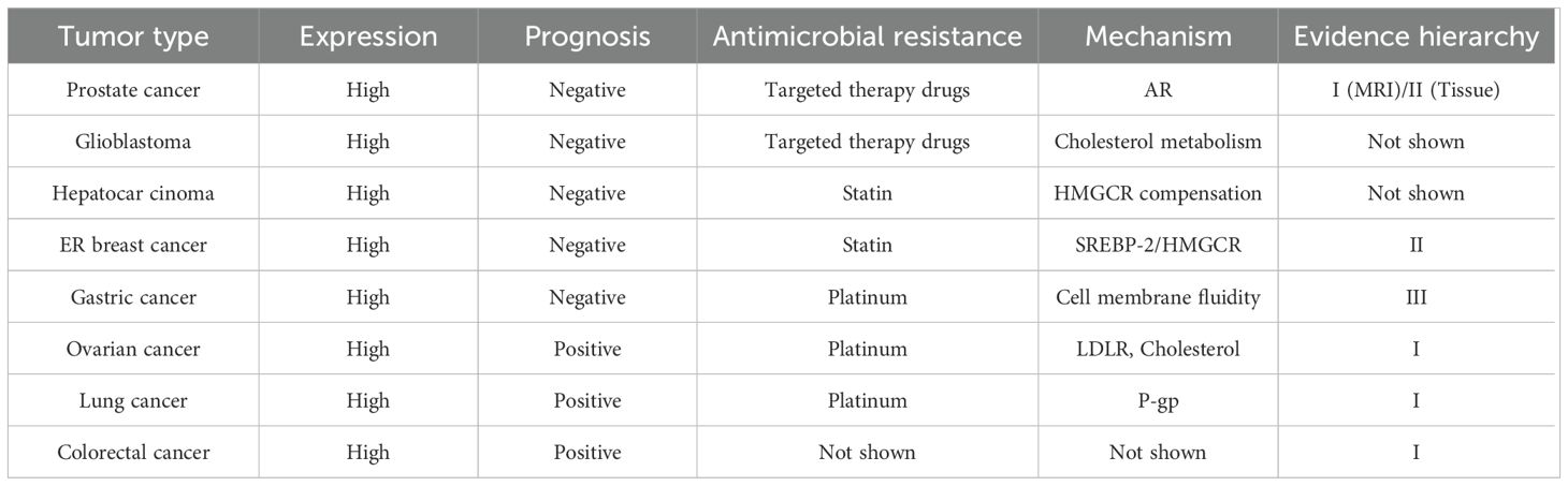 Given the established association of high cholesterol and sterol levels with increased cancer risk (81), it is imperative to investigate the significance of HMGCR expression in tumors. The expression of HMGCR correlates significantly with patient prognosis across multiple tumor types; however, such associations demonstrate tissue specificity, and the precise mechanisms and independent prognostic value remain to be elucidated. On one hand, in certain tumors, high HMGCR expression associates with poor prognosis and reduced survival. For example, HMGCR expression is significantly higher in hepatocellular carcinoma tissues than in adjacent noncancerous tissues, and its overexpression correlates with worse overall survival (OS) (20). Similarly, strong HMGCR expression in prostate cancer correlates with decreased biochemical recurrence (BCR)-free survival (86). On the other hand, in various tumor types, elevated HMGCR expression is associated with a better prognosis. This seemingly contradictory phenomenon may be related to the induction of apoptosis by isoprenoid substances generated in the mevalonate pathway (87, 88) or may be influenced by tumor-specific differences, such as estrogen receptor status. A study based on The Cancer Genome Atlas (TCGA) ovarian cancer dataset found that high HMGCR expression correlates with improved progression-free survival (PFS) (89). In colorectal cancer, HMGCR expression is associated with more advanced clinical staging but better prognosis (90). Taken together, HMGCR expression may serve as a potential prognostic marker, yet establishing its utility as an independent prognostic factor requires extensive experimental validation. Furthermore, the complex regulatory interactions between HMGCR expression and other genes and metabolic pathways may modulate its prognostic value; therefore, in-depth investigation into the specific roles and mechanisms of HMGCR in tumorigenesis and progression remains essential. Table 2 summarizes the prognostic significance and drug resistance associated with HMGCR in tumors.