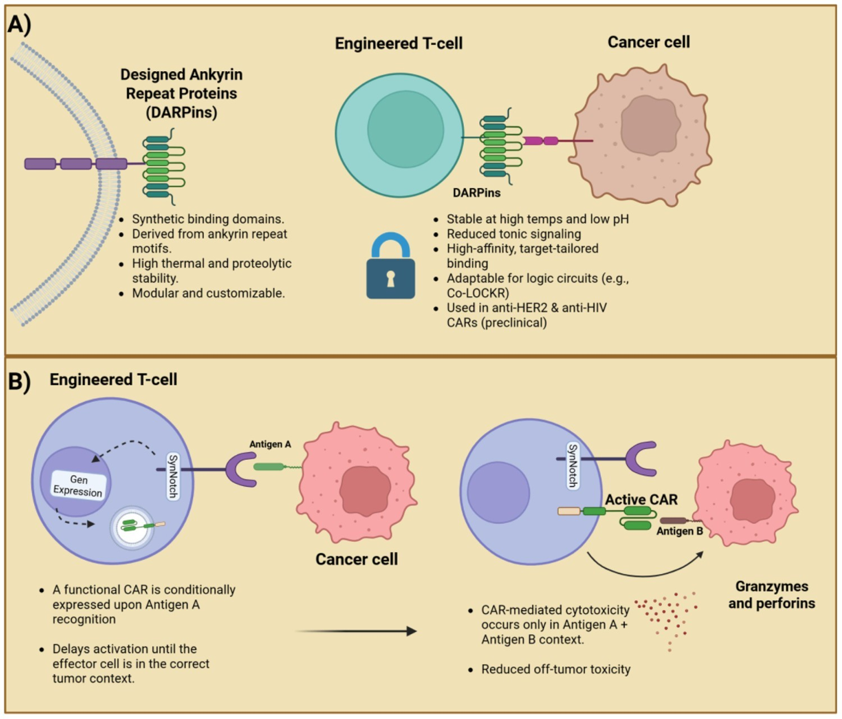 A dual-panel showcasing a schematic of DARPin targeting and SynNotch logic-gated activation. (A) DARPins: synthetic, stable, and customizable binders for target-specific CAR design. (B) SynNotch: a sequential antigen recognition enabling context-dependent CAR activation and reduced off-tumor toxicity.