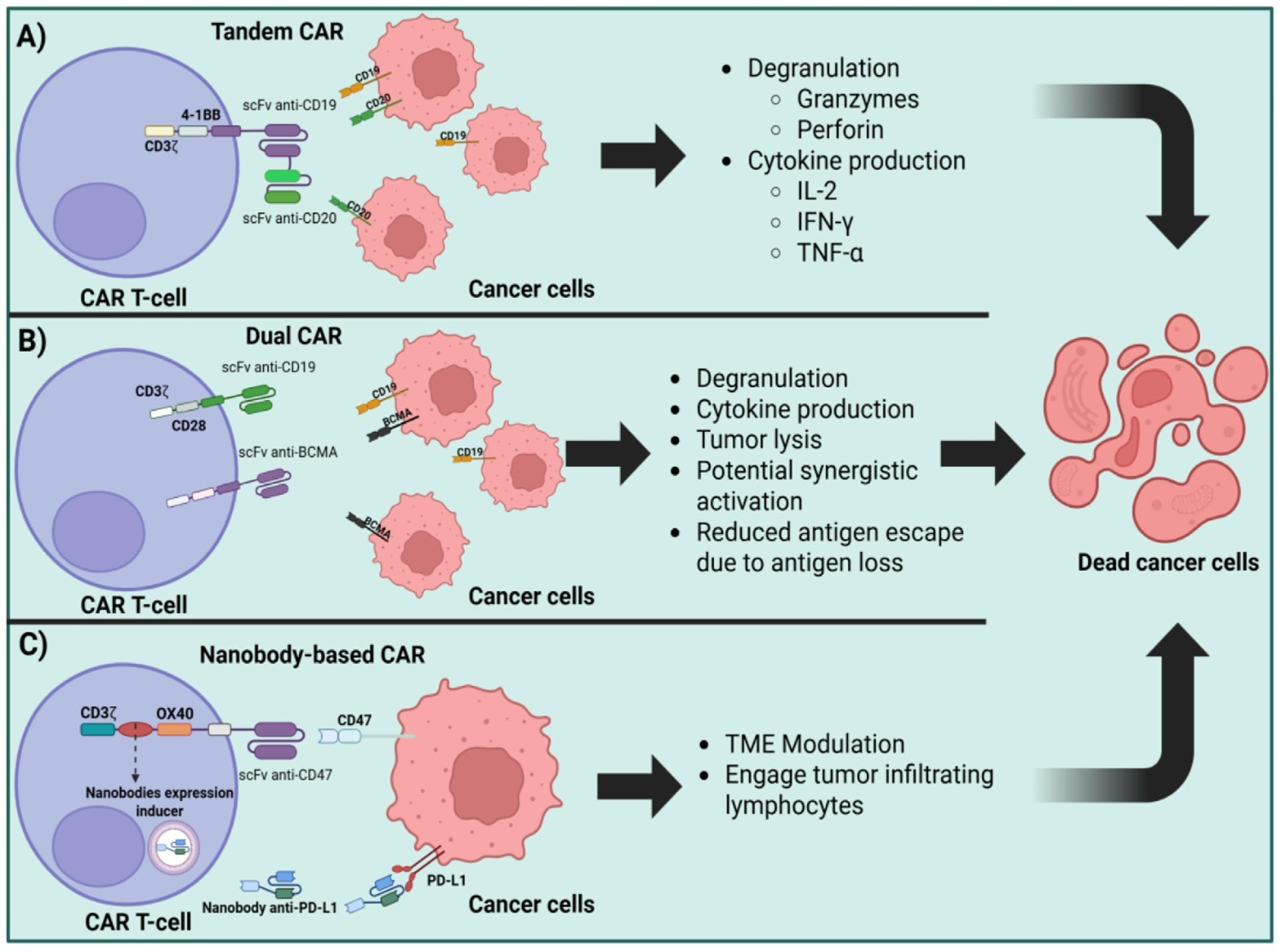 Strategies for CAR T-cell multi-target antigen recognition and TME immune modulation. (A). Advanced CAR T-cell architectures: tandem CARs (simultaneous recognition of CD19 and CD20), (B) dual-CARs (independent recognition of CD19 and BCMA), and (C) nanobody based CARs (targeting CD47 and PD-L1).