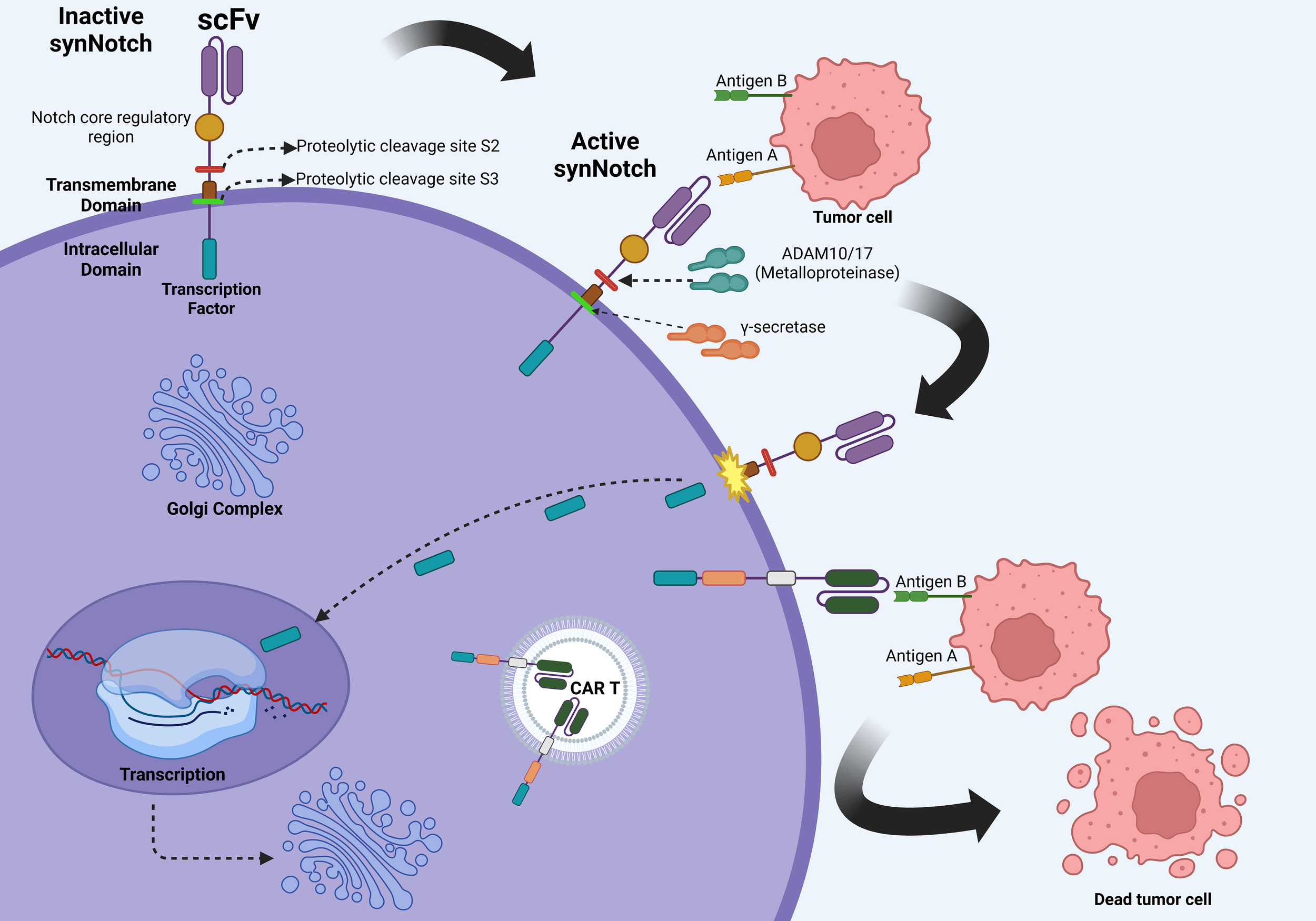 Molecular mechanisms of the synNotch system. The initial binding of the SynNotch receptor to Antigen A triggers ADAM10/17-mediated S2 cleavage, followed by γ-secretase–mediated S3 cleavage, releasing an intracellular transcription factor. This factor translocates to the nucleus, driving CAR expression against Antigen B, thereby enabling context-dependent tumor recognition and cytotoxicity while minimizing off-target effects. Created in BioRender. Victoria, J. (2025) https://BioRender.com/evhzk5f.
