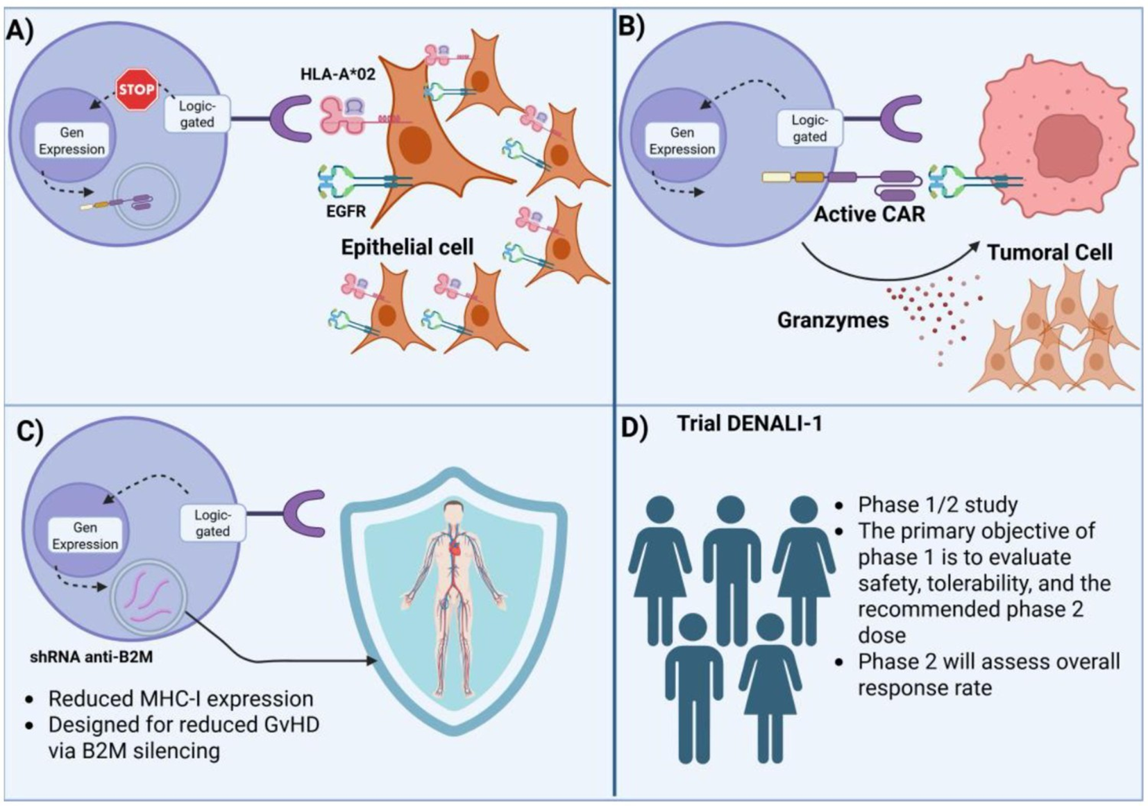 Mechanistic overview of a clinical SynNotch logic-gated CAR T-cell design (DENALI-1 trial). (A) Initial antigen recognition (HLA-A*02 and EGFR) suppresses gene expression in non-target epithelial cells, preventing off-tumor activation. (B) Sequential logic gating activates CAR expression only in the presence of the defined antigenic context, triggering tumor cell killing via granzyme release. (C) shRNA-mediated β2M silencing reduces MHC-I expression, designed to minimize graft-versus-host disease (GvHD). (D) DENALI-1 trial schema: Phase 1/2 study evaluating safety, tolerability, recommended phase 2 dose, and overall response rate.