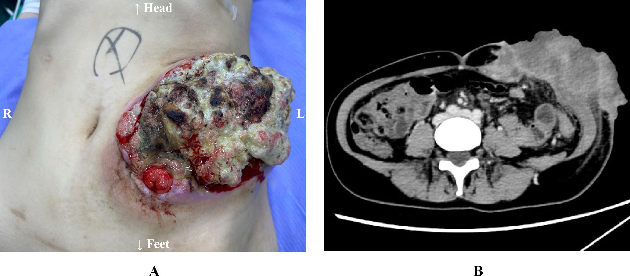 A 35-year-old woman presented with a local recurrence at the stoma site three months after Hartmann’s procedure for sigmoid colon cancer. In the subsequent months, the tumor exhibited rapid progression, with direct invasion into the abdominal wall. Her clinical course was characterized by persistent pain, fever, foul odor, and defecation disorder. The substantial disease burden confined her to bed, leaving her unable to care for her two young children. Following a multidisciplinary team (MDT) evaluation, she was deemed a candidate for reoperative surgery. The procedure comprised en bloc resection of the recurrent tumor, followed by restoration of bowel continuity with a primary colorectal anastomosis and immediate abdominal wall reconstruction. The patient’s postoperative recovery was uneventful, with a marked improvement in quality of life. This case highlights the critical role of flap-based reconstruction in managing complex abdominal wall defects.