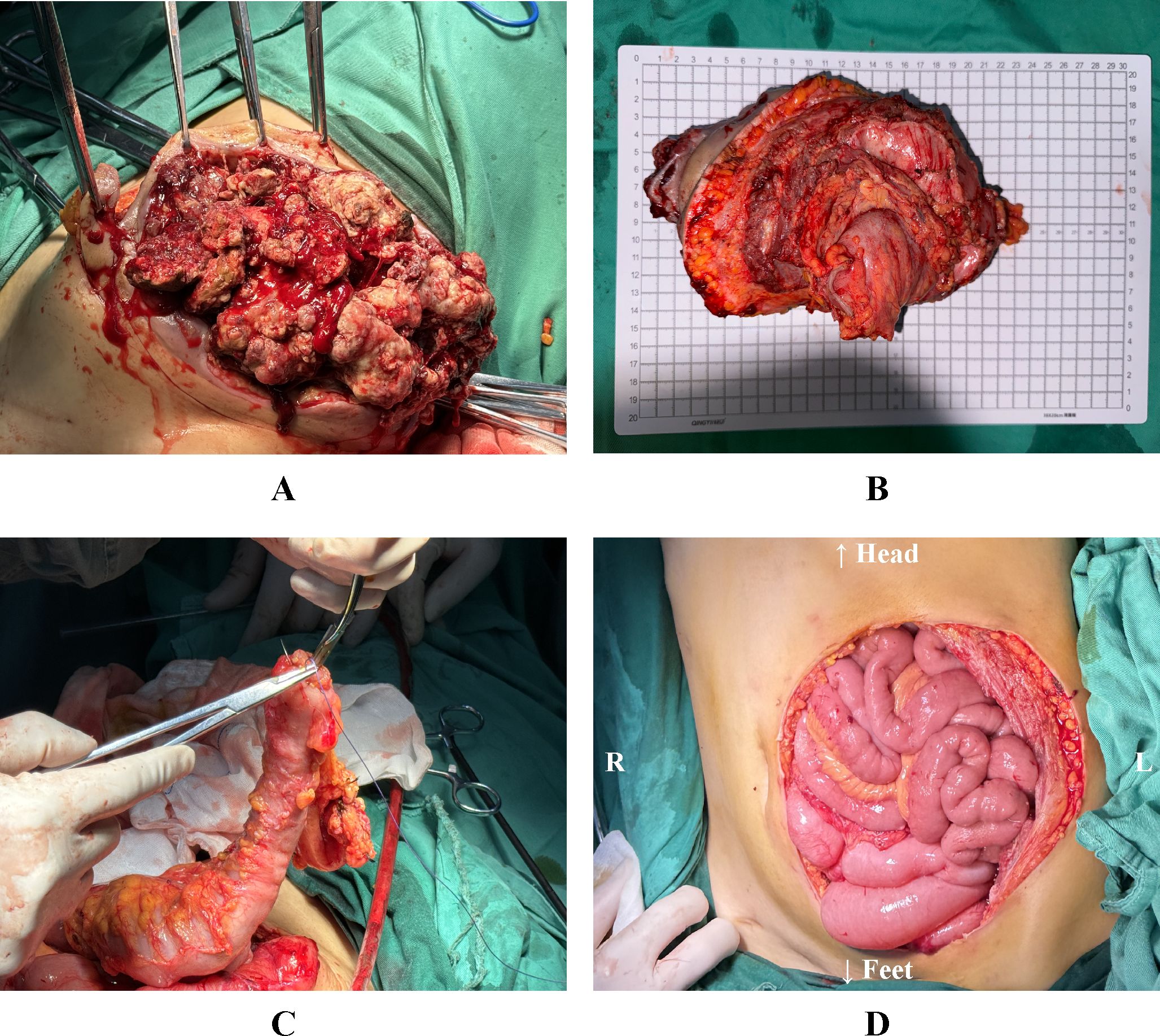 Following MDT discussions that deemed surgical intervention the optimal approach, the procedure was performed under general anesthesia one week later. Intraoperative exploration identified a large local recurrence at the stoma site, with invasion into the rectus abdominis muscle and the underlying bowel, accompanied by abdominal adhesions and ascites. First, an en bloc resection of the recurrent tumor and the involved abdominal wall was performed. The sigmoid colon was transected with an adequate margin from the tumor using a linear stapler. Finally, the intra-abdominal tumor component was completely resected en bloc, which included excision of the invaded left-sided partial rectus abdominis muscle and sigmoid colon. This resulted in an abdominal wall defect of approximately 180 cm². To achieve a tension-free anastomosis during digestive tract reconstruction, the splenic flexure and descending colon were fully mobilized. An end-to-side anastomosis was then performed between the distal end of the descending colon and the lateral wall of the upper rectal stump (Figure 2).