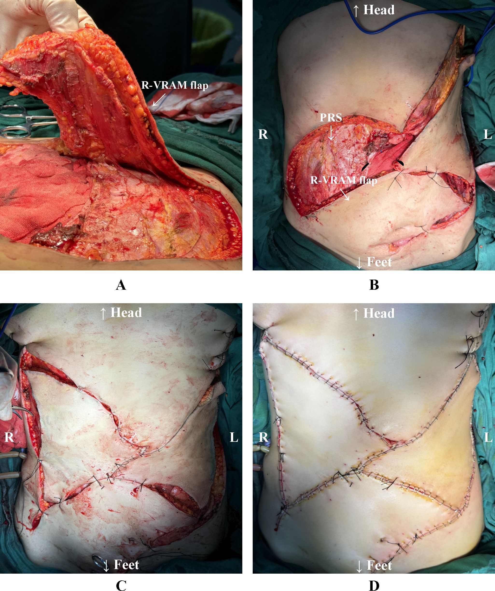Figure 3. (A) Preparation of the right-sided pedicled VRAM flap. (B) The VRAM flap is rotated to the left toward the lower edge of the abdominal wall defect. The right-sided donor site preserves the posterior rectus sheath. (C) The VRAM flap was preliminarily sutured to the lower edge of the defect. The bilateral V-Y advancement flaps were preliminarily sutured. (D) All flaps were completely sutured and reinforced with staples. L: The patient’s left side. R: The patient’s right side. R-VRAM flap: Right-sided vertical rectus abdominis myocutaneous flap; PRS: Posterior rectus sheath.