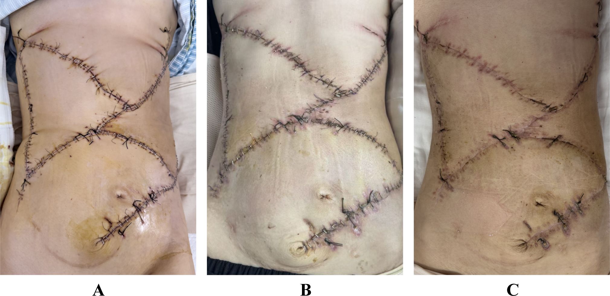 Subsequently, the right-sided pedicled VRAM flap based on the inferior epigastric artery was raised. The superior border of the VRAM flap extended to the right costal margin, the inferior border reached the superior border of the pubis, the medial border was at the abdominal wall defect, and the lateral border extended to the anterior axillary line. The VRAM flap was elevated in its entirety with preservation of the posterior sheath and peritoneum at the donor site. It was then rotated to the left and advanced to cover the defect in the left lower abdomen. After provisional fixation of the flap, adequate coverage was confirmed. According to the actual defect size, bilateral V-Y advancement flaps were designed along the inferior margins of the bilateral costal arches. These flaps were then mobilized to repair the residual defect by exploiting their inherent elasticity and mobility. Throughout the procedure, meticulous attention was paid to preserving the blood supply to both flaps. The bilateral V-Y advancement flaps were sutured in layers to the inverted pedicled VRAM flap and the surrounding abdominal wall. Skin approximation was reinforced with surgical staples (Figure 3).