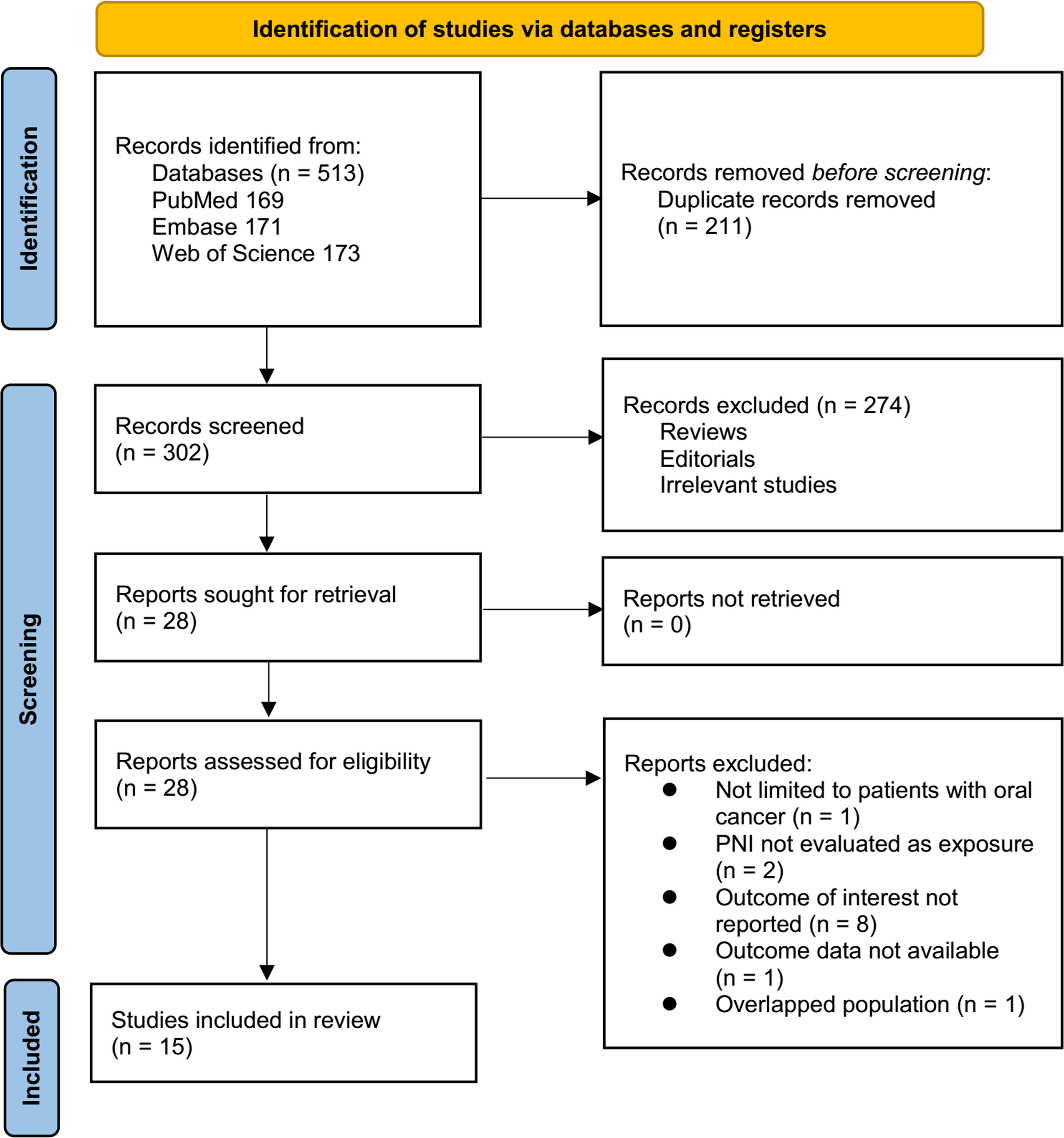Case reports, case series, reviews, editorials, meta-analyses, animal studies, studies not limited to patients with OC, lacking PNI as exposure, or lacking survival outcomes or insufficient data to calculate HRs with 95% CIs were excluded. For duplicate reports from the same patient cohort, only the study with the largest sample size was included.