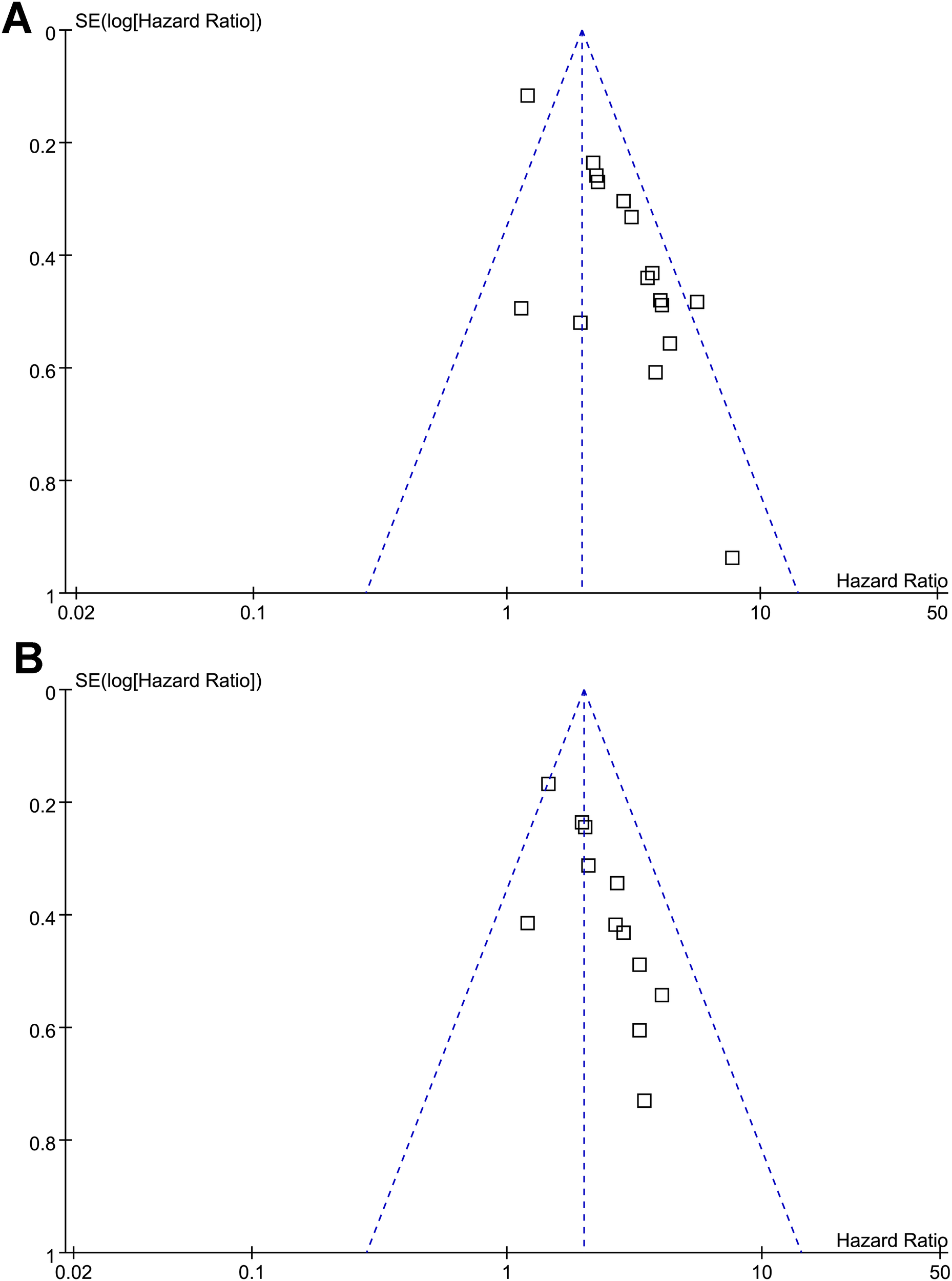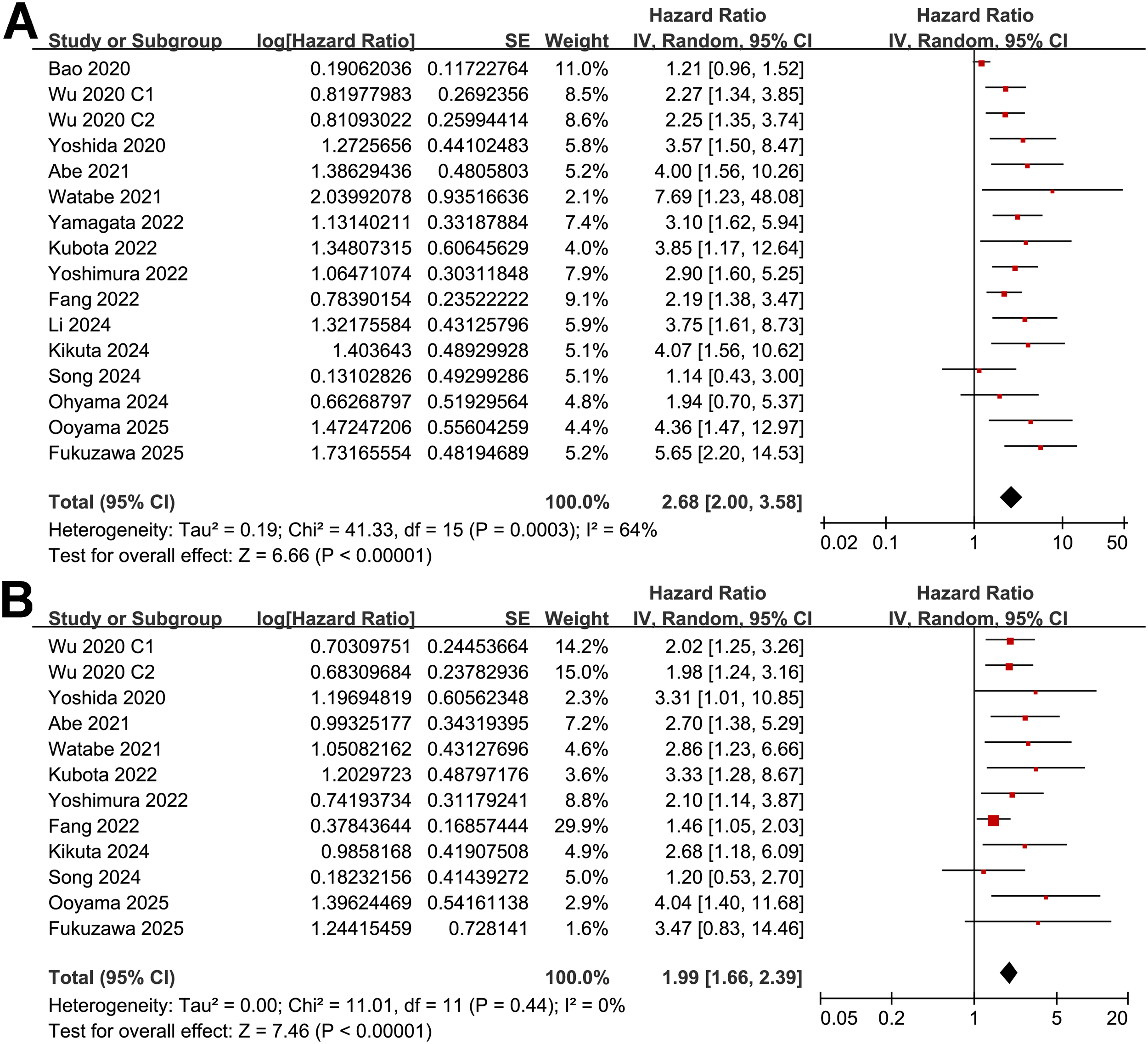 Forest plots for the meta-analysis of the association between a low PNI and survival outcome of patients with OC; (A) forest plots for the meta-analysis of the association between a low PNI and OS; and (B) forest plots for the meta-analysis of the association between a low PNI and PFS;.