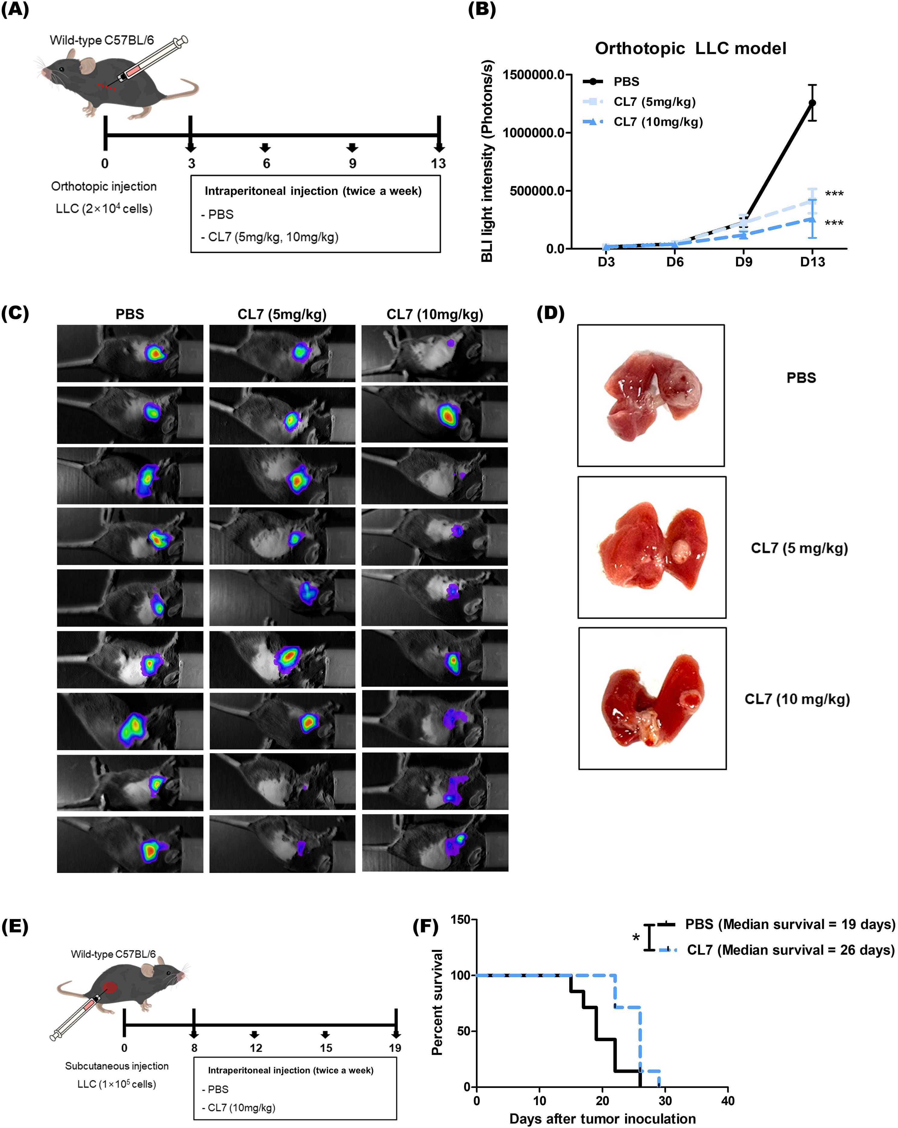 Figure 1. CL7 treatment significantly inhibits tumor growth and progression in an NSCLC model. (A) Schematic diagram of the in vivo experimental schedule. LLC-luc cells (2 × 104) were injected into the left lung (between the fifth and sixth ribs) using an insulin syringe. Three days post-inoculation, mice received intraperitoneal injections of CL7 (5 or 10 mg/kg; CentricsBio) twice a week. The PBS was administered on the same schedule as the CL7 treatment. (B, C) Tumor progression was monitored using in vivo bioluminescence imaging after four drug administrations. (D) Mice were sacrificed, and lung tissues were collected for analysis. Only representative data from the 10 mg/kg CL7 group are shown to maintain consistency with subsequent analyses. All data are presented as mean ± SEM. *p < 0.05, ***p < 0.001 versus PBS group (n = 9). (E) In a subcutaneous model, regular LLC cells (1 × 105) were injected into the right flank of mice. When tumor volumes reached 50 mm³, mice were intravenously treated with CL7 (10 mg/kg) every three days. Mice were sacrificed once tumor diameters reached 1.5 cm. (F) Kaplan-Meier survival analysis was performed in the orthotopic NSCLC model. Median survival was 19 days for the PBS group and 26 days for the CL7-treated group (n = 7). *p < 0.05 versus PBS group (log-rank test).