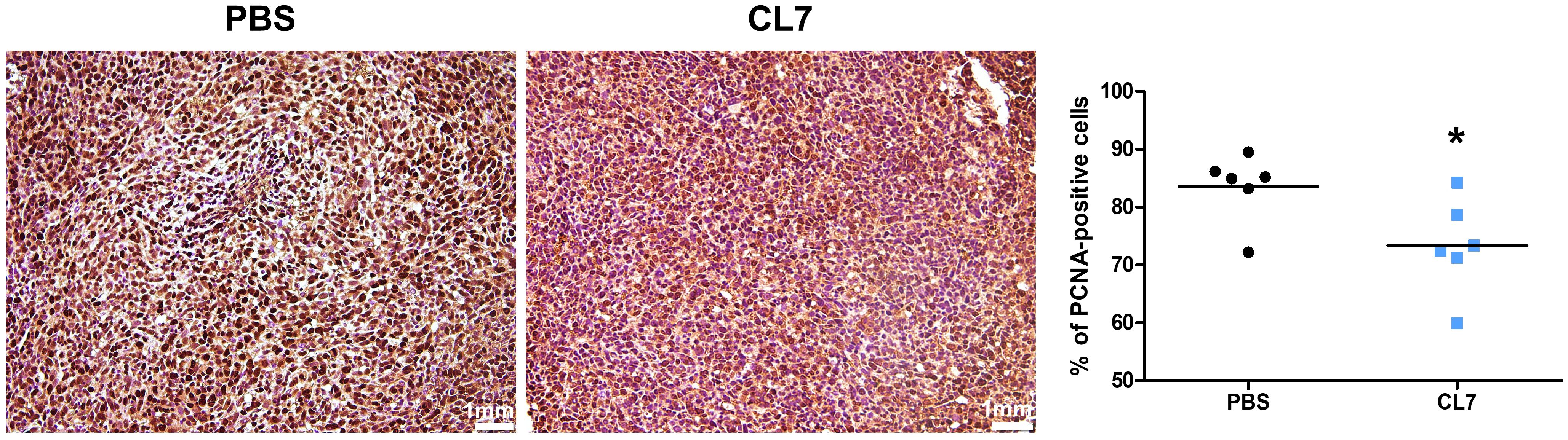 To investigate whether CL7 affects the tumor cell proliferation in NSCLC, the expression of PCNA, a proliferation marker in tumor tissues were examined by immunohistochemistry. The PCNA expression was reduced in a CL7-treated group compared to PBS group. In line with the reduced tumor growth, PCNA-positive cells were significantly decreased in CL7 group (Figure 2). These results demonstrate that CL7 inhibit the tumor growth and proliferation.
