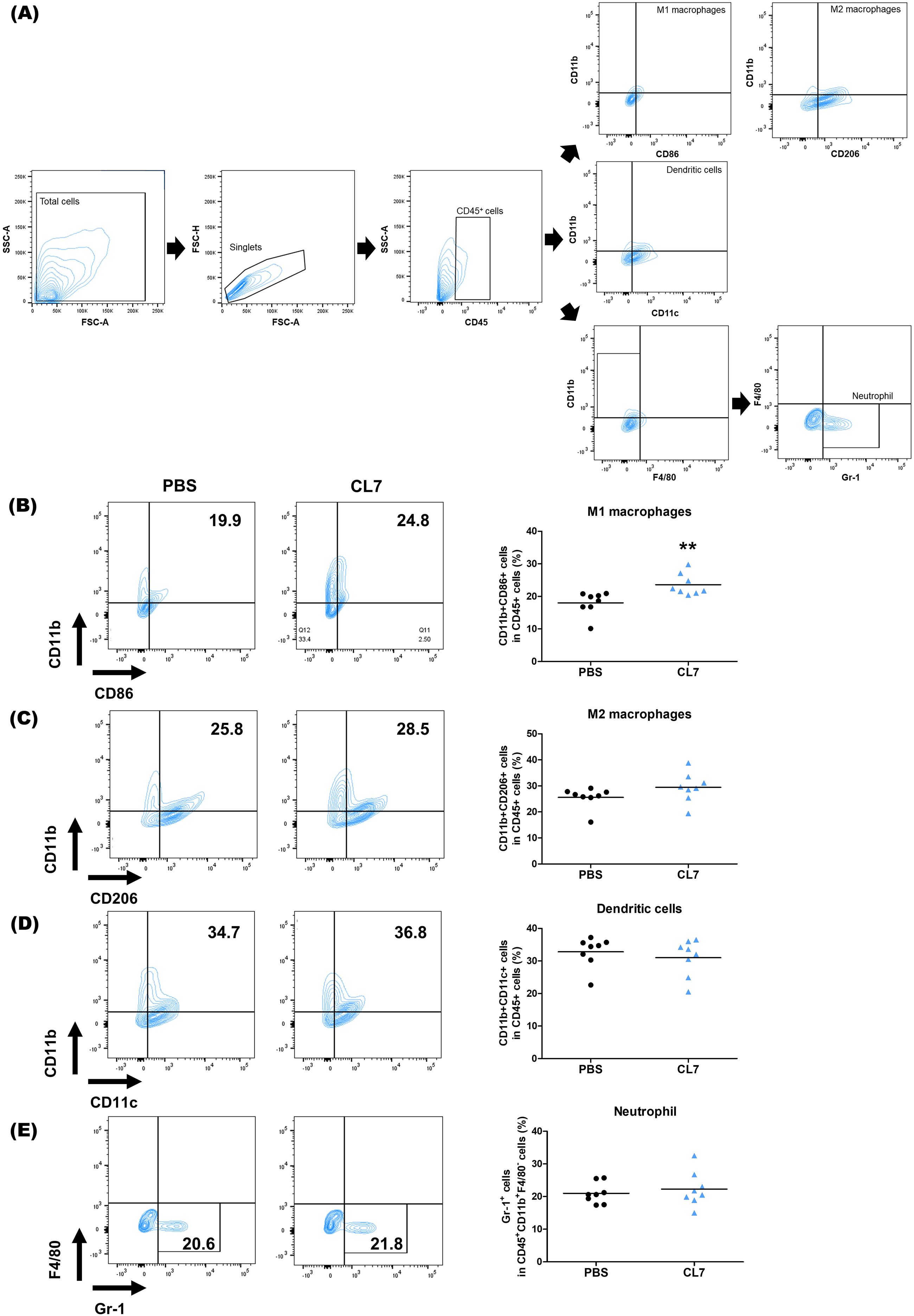 Flow cytometry analysis diagrams showing cell gating and population assessments. Panel A depicts the gating strategy for total cells, singlets, and CD45+ cells, leading to subsets: M1 and M2 macrophages, dendritic cells, and neutrophils. Panels B to E show comparisons between PBS and CL7 treatments for each cell type, with scatter plots quantifying percentages and indicating significant differences for M1 macrophages. Each plot is labeled with axes representing specific markers, such as CD11b, CD86, CD206, CD11c, F4/80, and Gr-1.