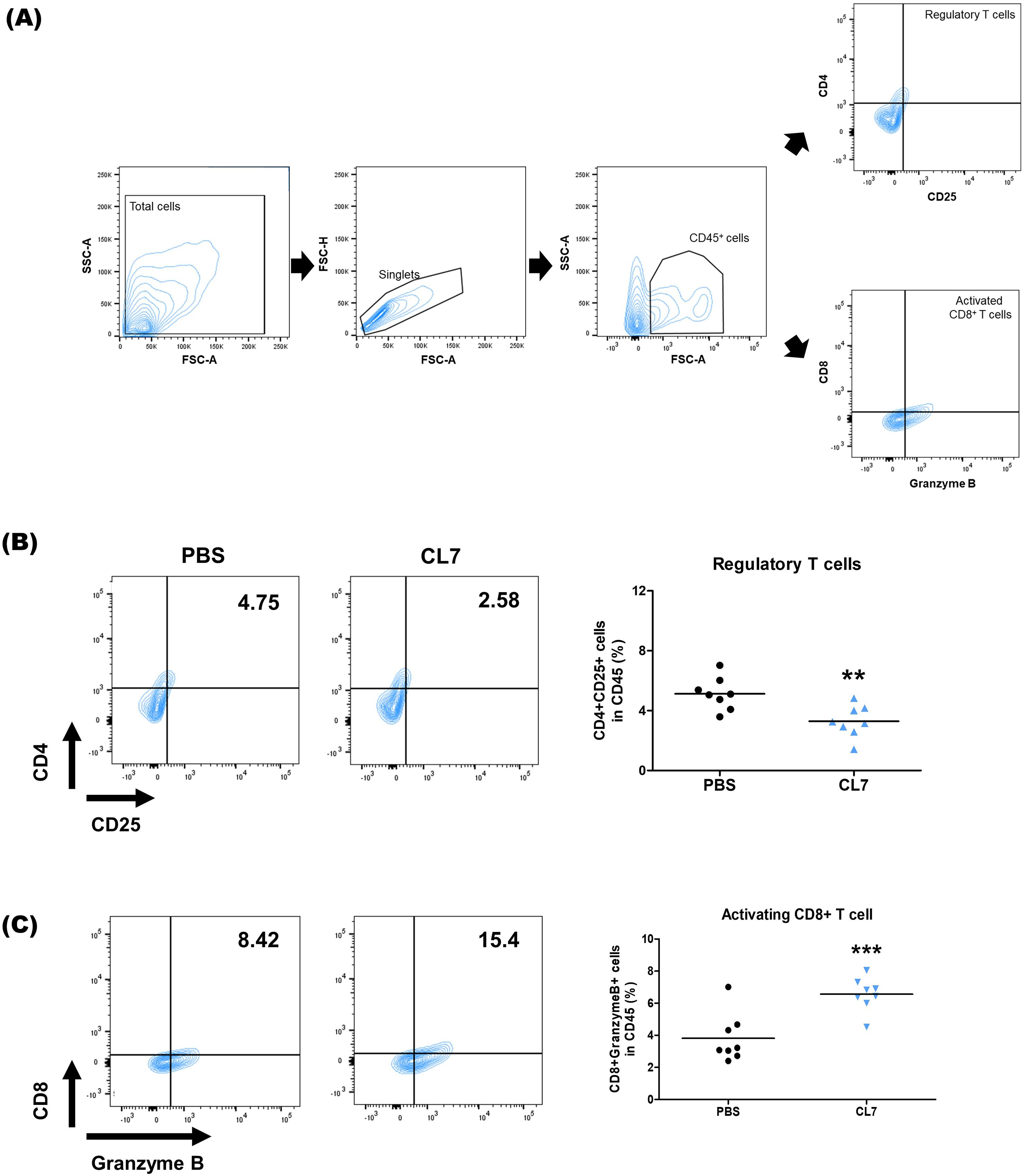 Flow cytometry diagrams depict the gating strategy and cell analysis. Panel A shows sequential gates from total to CD45+ cells, leading to plots for regulatory T cells (CD4+ CD25+) and activated CD8+ T cells (Granzyme B+). Panel B compares percentages of regulatory T cells for PBS and CL7 groups, with a dot plot indicating a significant decrease in the CL7 group. Panel C compares percentages of activating CD8+ T cells, with a significant increase in the CL7 group as shown in the accompanying dot plot. Statistical significance is marked by asterisks.