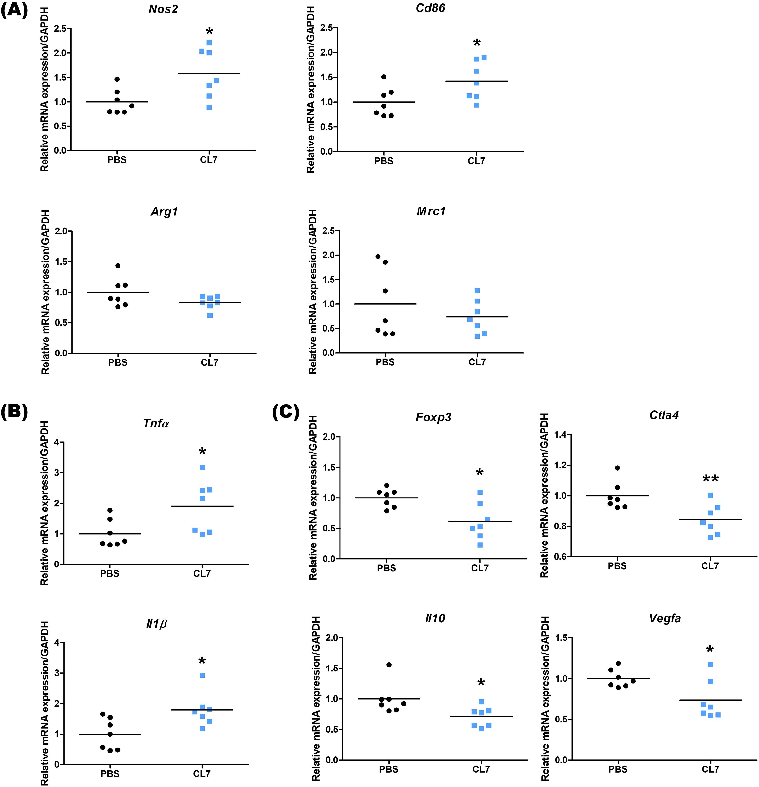 Graphs showing relative mRNA expression of various genes normalized to GAPDH across PBS and CL7 groups. Panel A includes Nos2, Cd86, Arg1, and Mrc1, with significant increases in the CL7 group for Nos2 and Cd86. Panel B shows Tnfα and Il1β, both significantly increased in CL7. Panel C displays Foxp3, Ctla4, Il10, and Vegfa, with significant increases in CL7 for Ctla4, Il10, and Vegfa. Data points are shown with mean lines, and significance is indicated by asterisks.