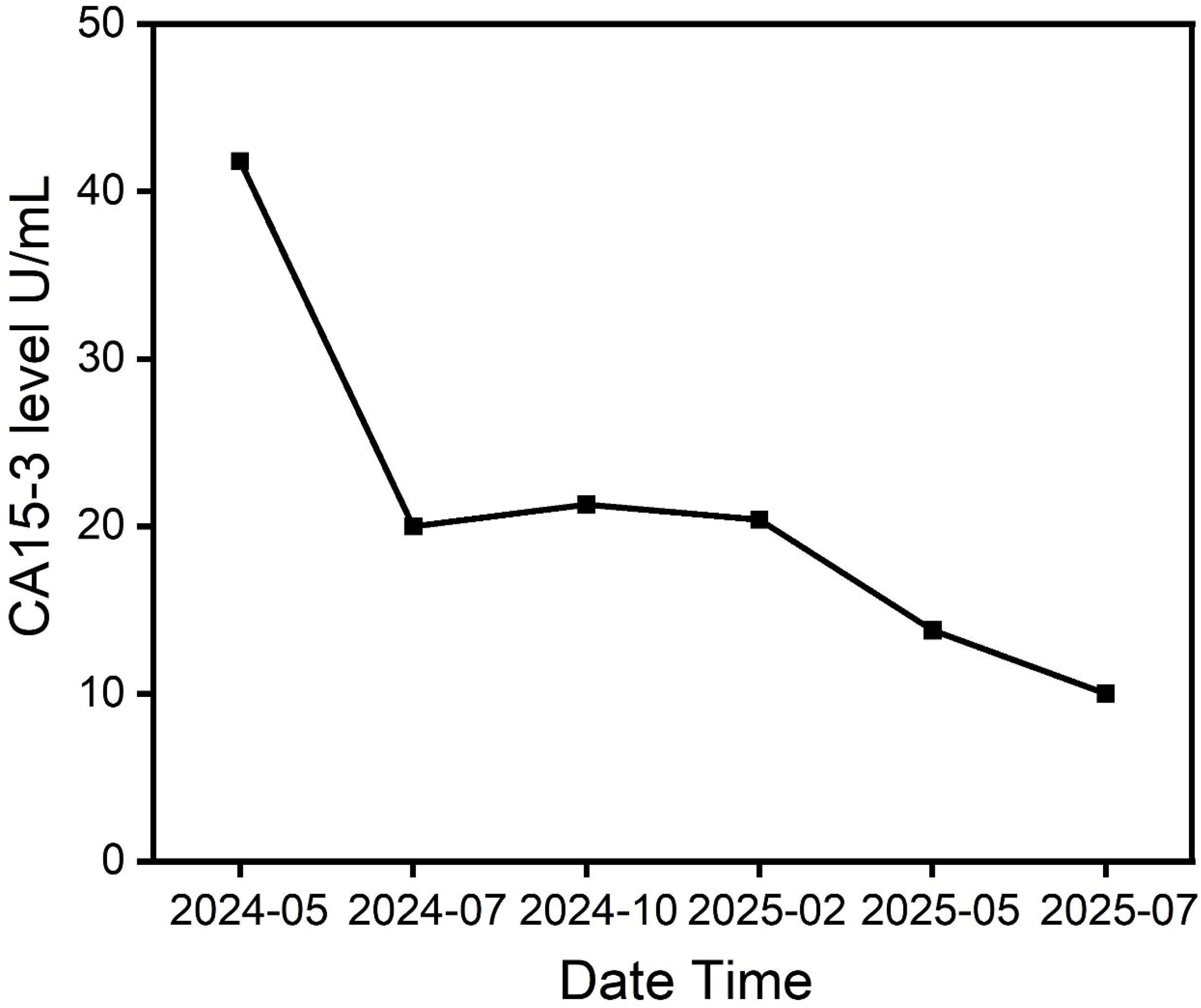 In cases of peritoneal metastasis, we tested more commonly used markers (such as CA-125), but their baseline levels were not high. We chose to monitor CA15-3, although this marker is non-specific, because its baseline level was elevated and synchronized with changes in tumor burden. The tumor marker CA15–3 gradually decreased, indicating a significant therapeutic effect (Figure 2; Table 1).